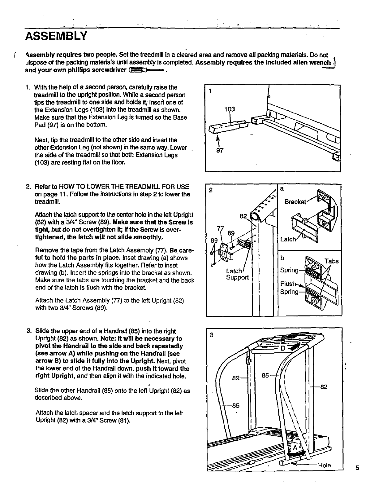 tips the treadmill to one side and holds it, Insert one of