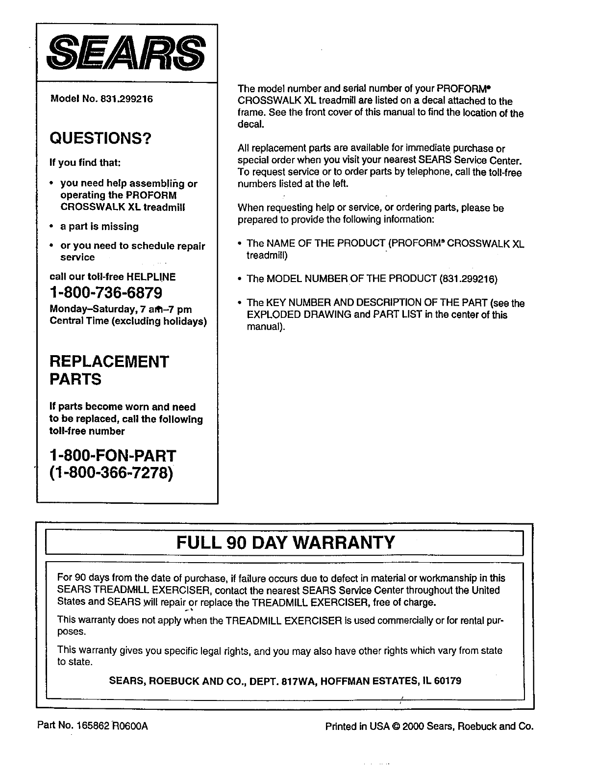 Part No. 165862 R0600A Printed in USA ©2000 Sears, Roebuck and Co.