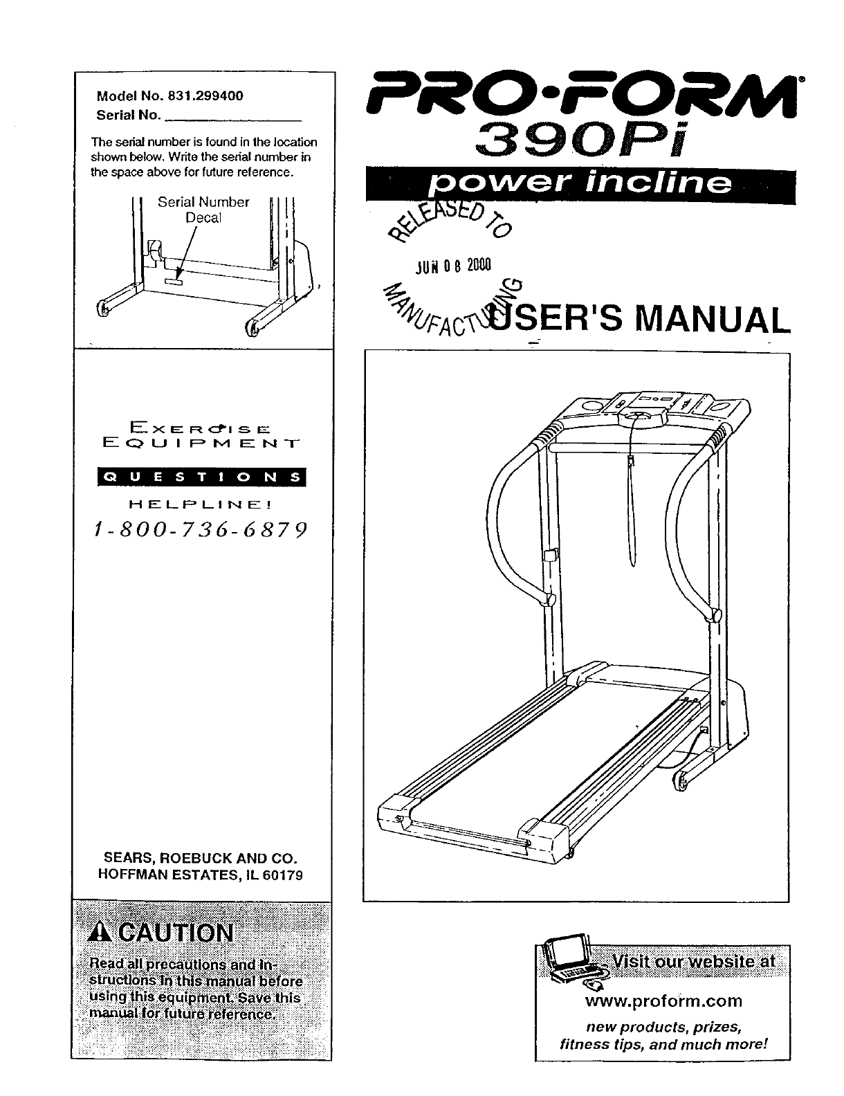 User Manual: Proform 831299400 831299400 PROFORM PROFORM 390PI - Manuals and Guides View the owners manual for your PROFORM PROFORM 390PI #831299400. Home:Fitness Equipment Parts:Proform Parts:Proform PROFORM 390PI Manual