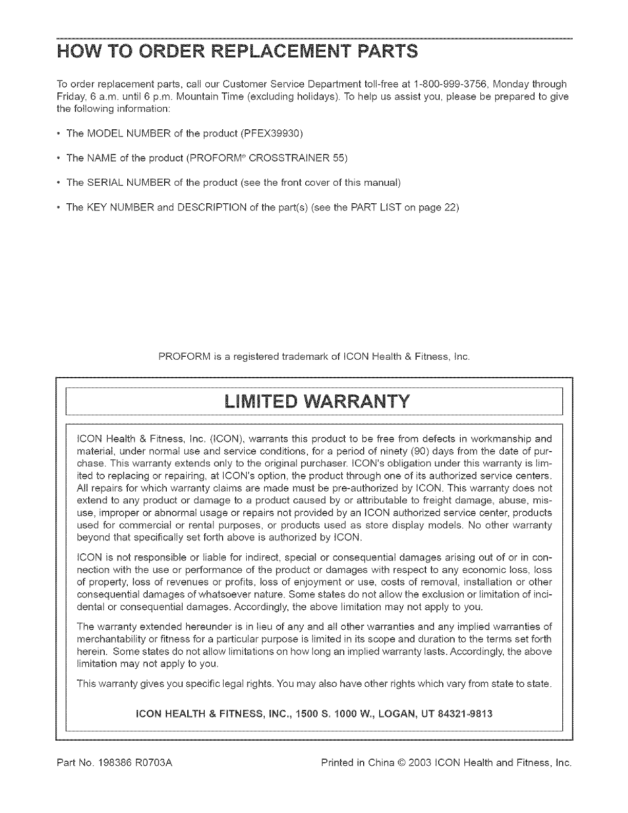Part No. 198386 R0703A Printed in China © 2003 ICON Health and Fitness, Inc.