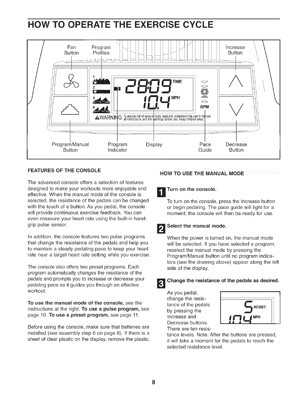 HOW TO OPERATE THE EXERCISE CYCLE .................................................... 8