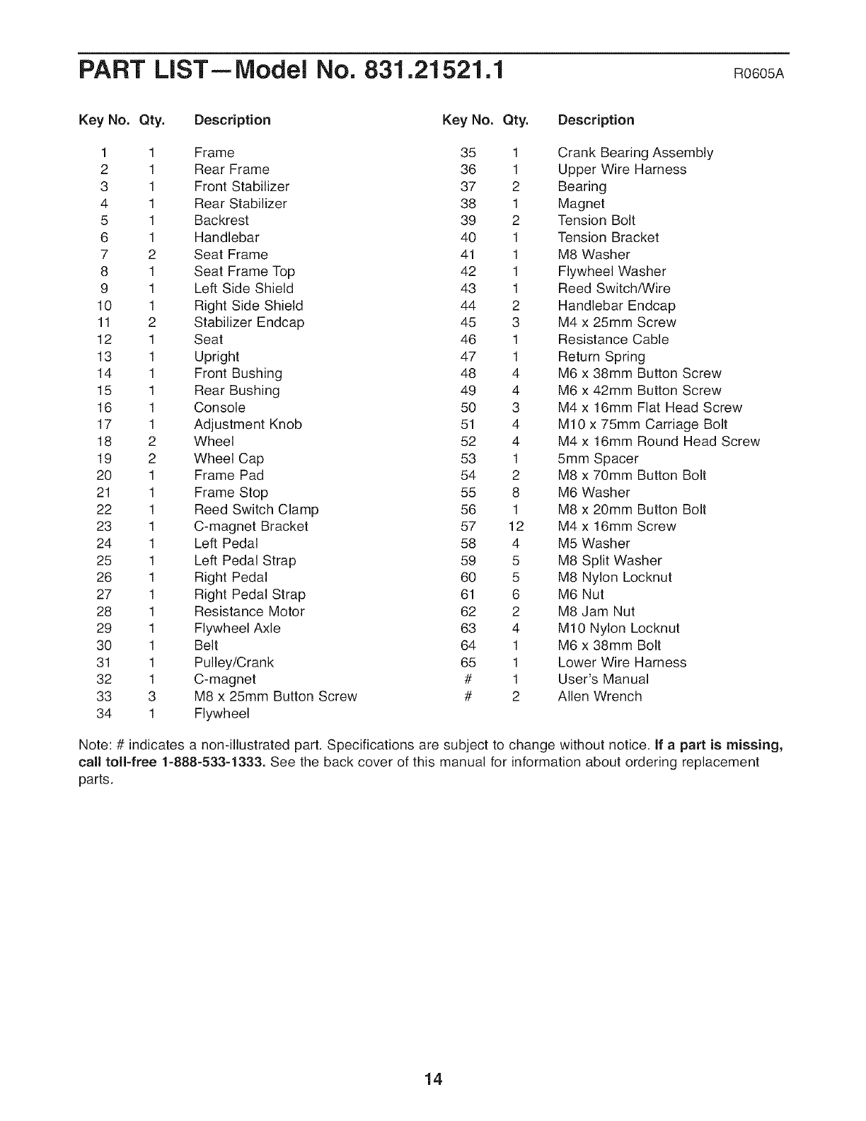 PART LIST--Model No. 831.21521.1 Ro6osA