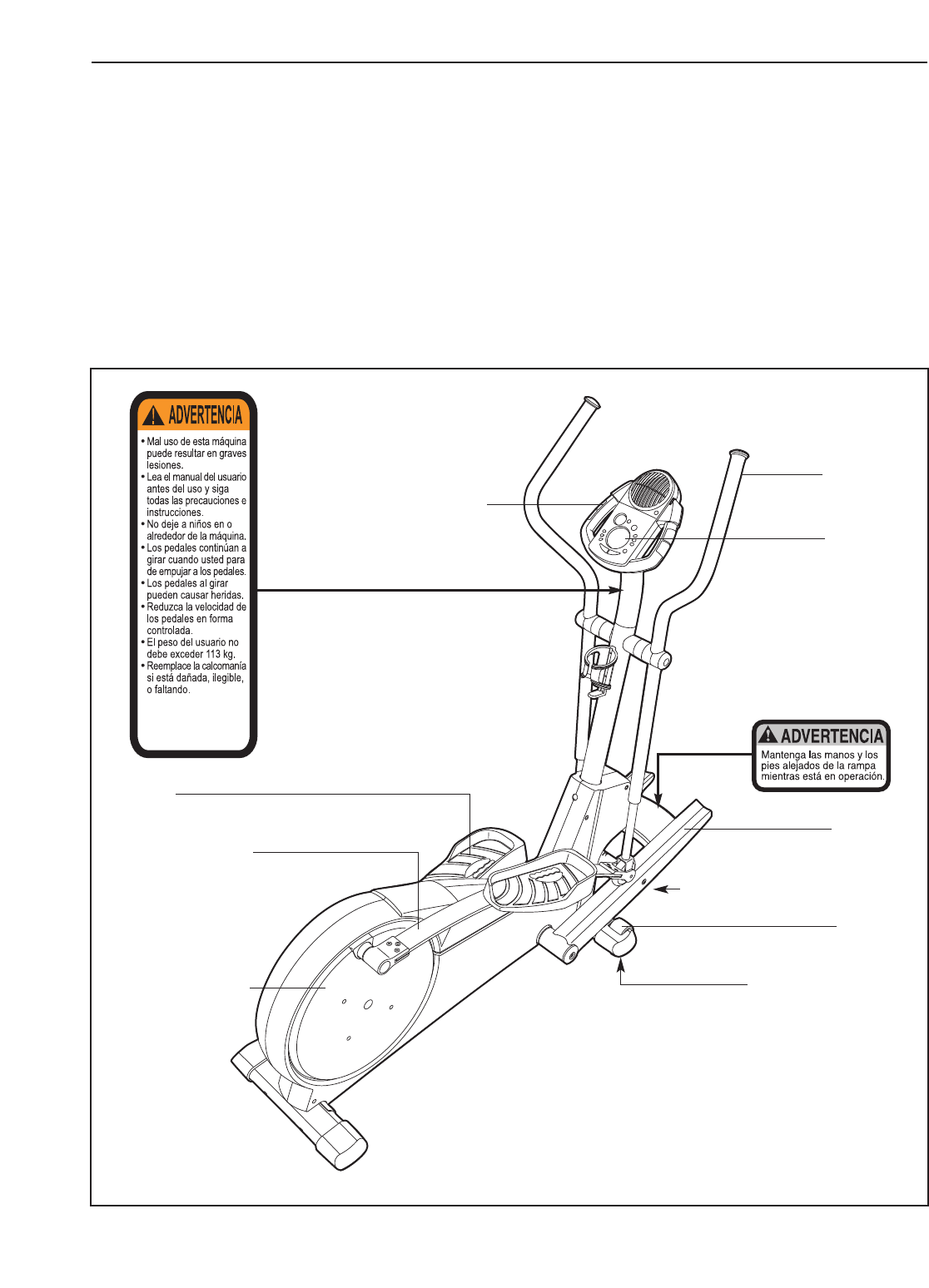 AVISO: Para reducir el riesgo de lesiones serias, antes de usar el entrenador elíptico lea