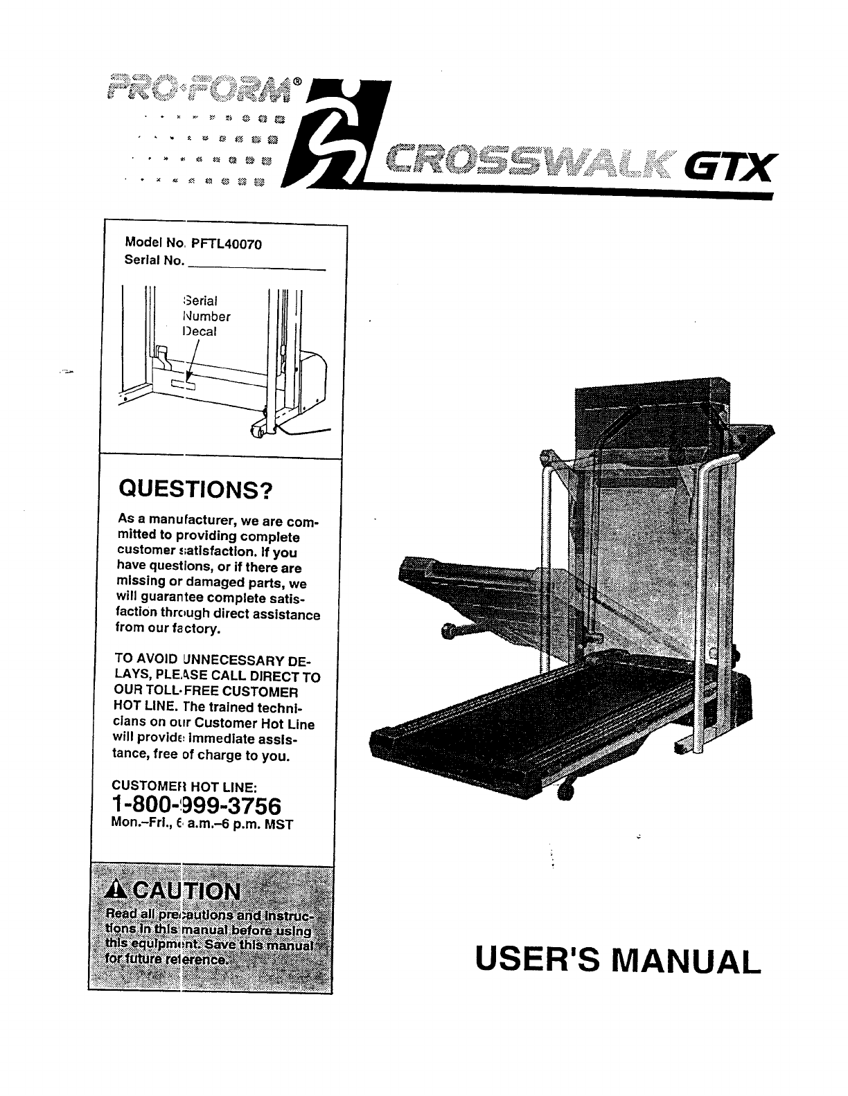 Proform Pftl40070 Crosswalk Gtx Treadmill Users Manual