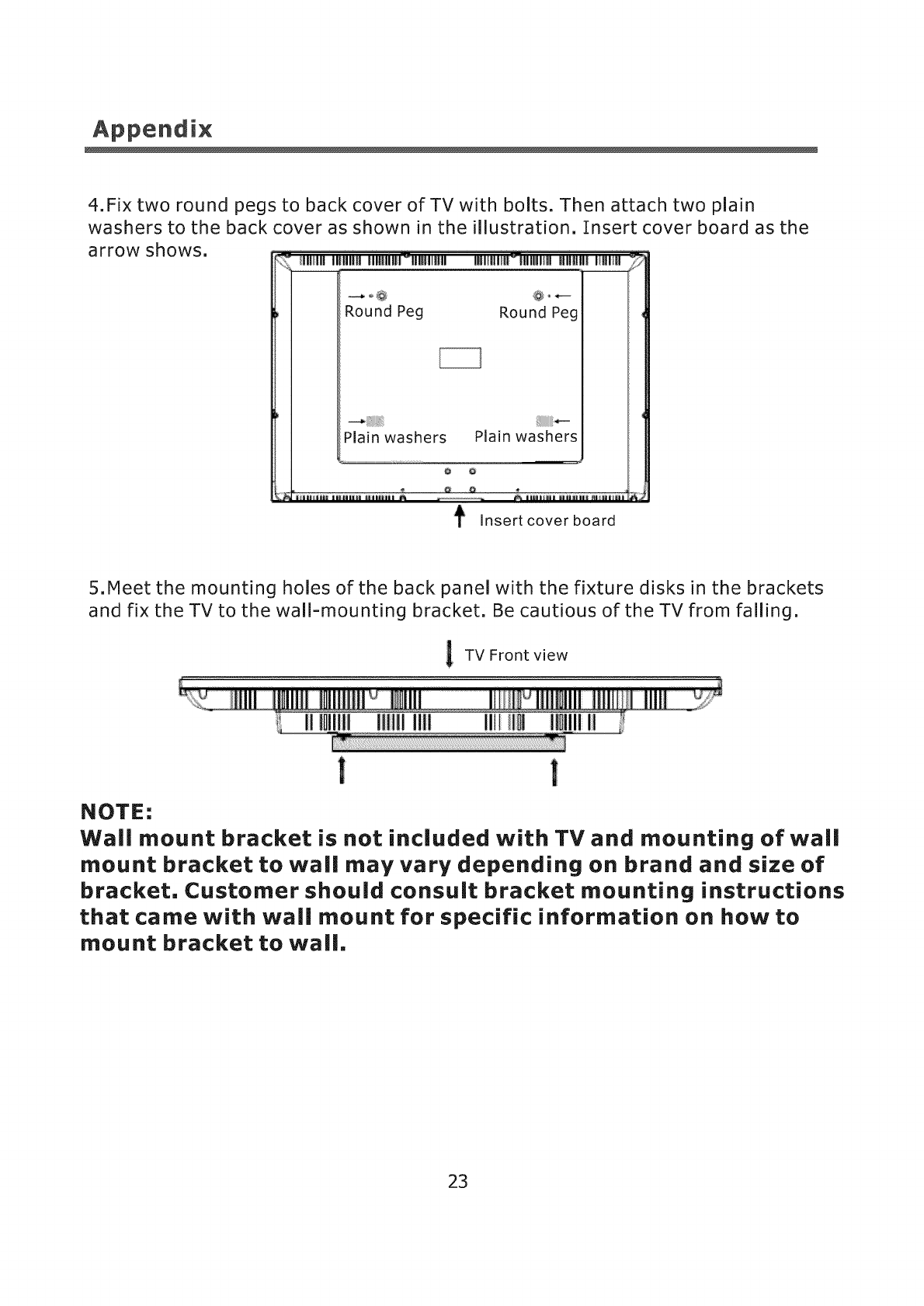 4.Fix two round pegs to back cover of TV with bolts. Then attach two plain