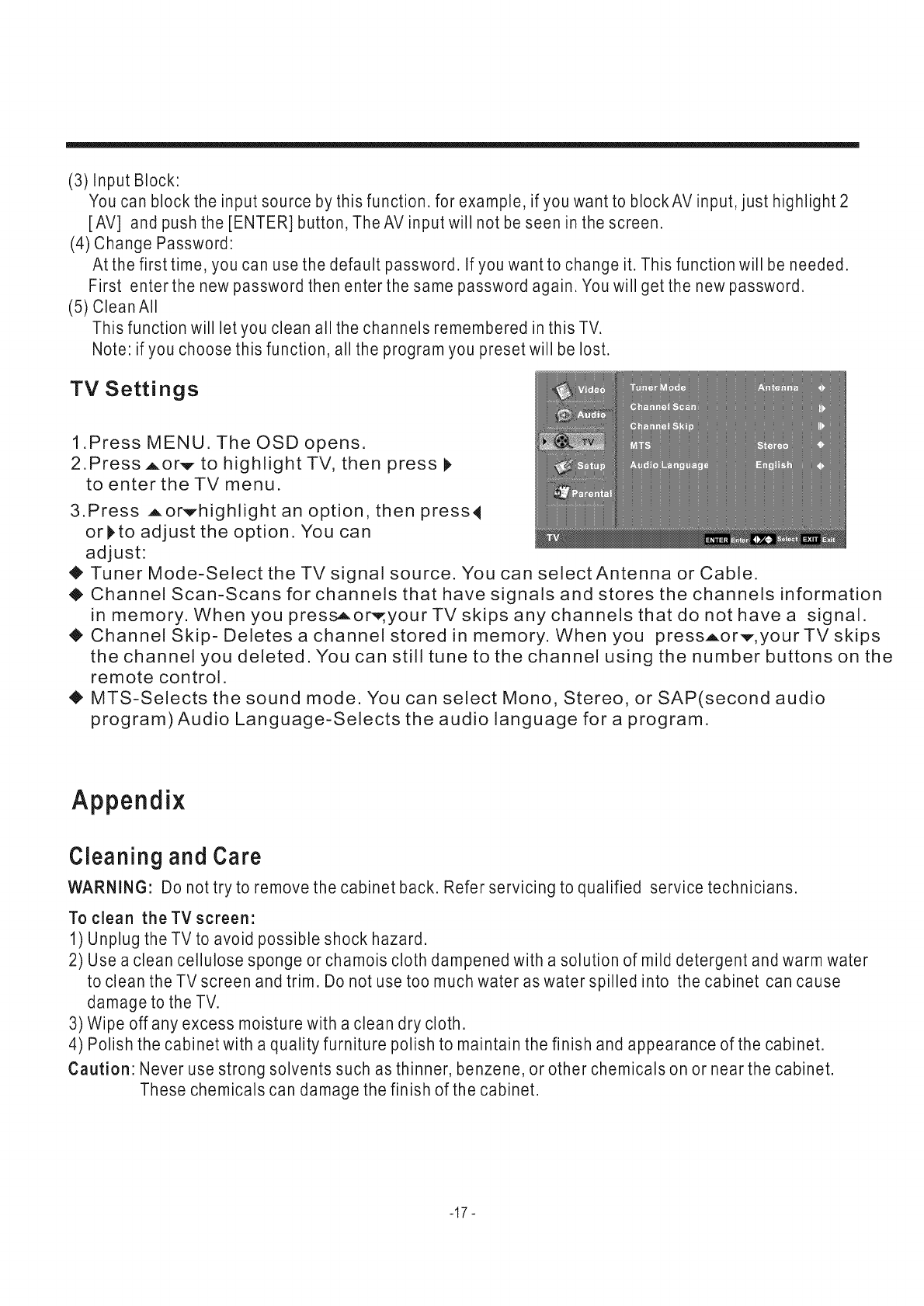 to clean the TV screen and trim. Do not use too much water as water spilled into the cabinet can cause