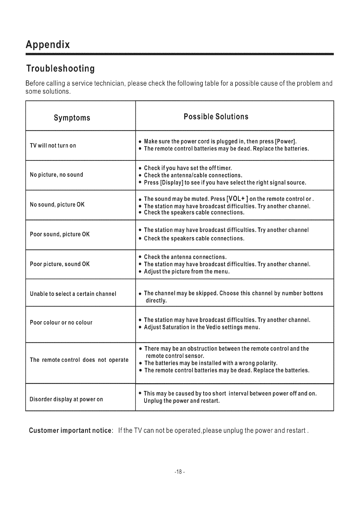 Before calling a service technician, please check the following table for a possible cause of the problem and
