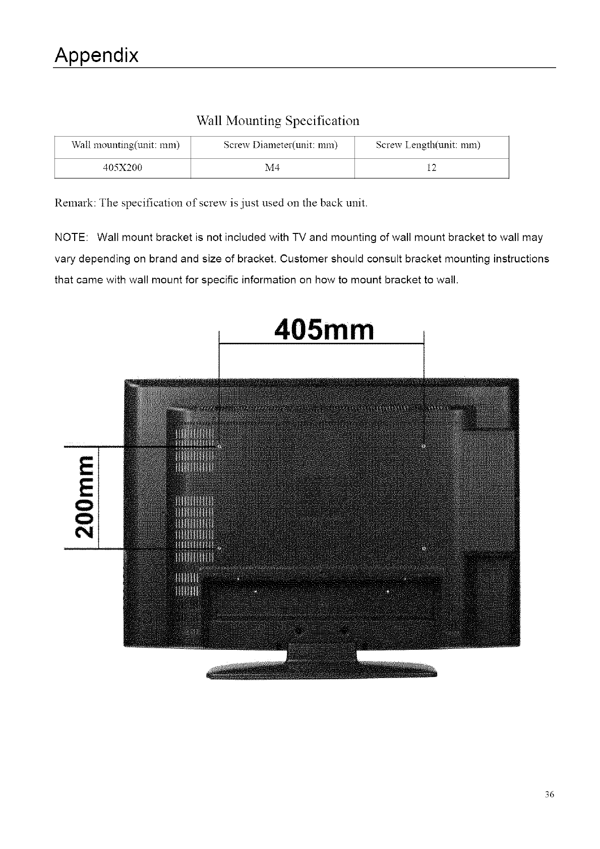 NOTE: Wall mount bracket is not included with TV and mounting of wall mount bracket to wall may