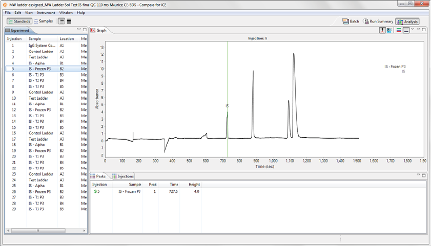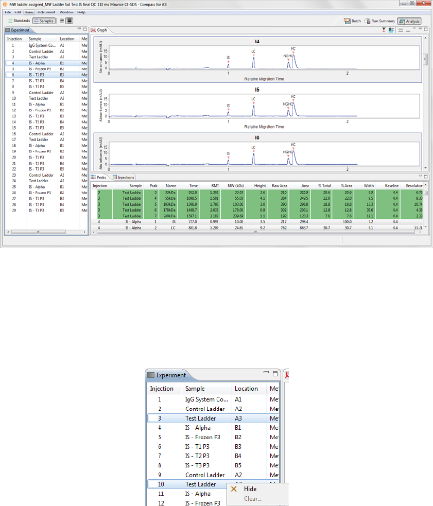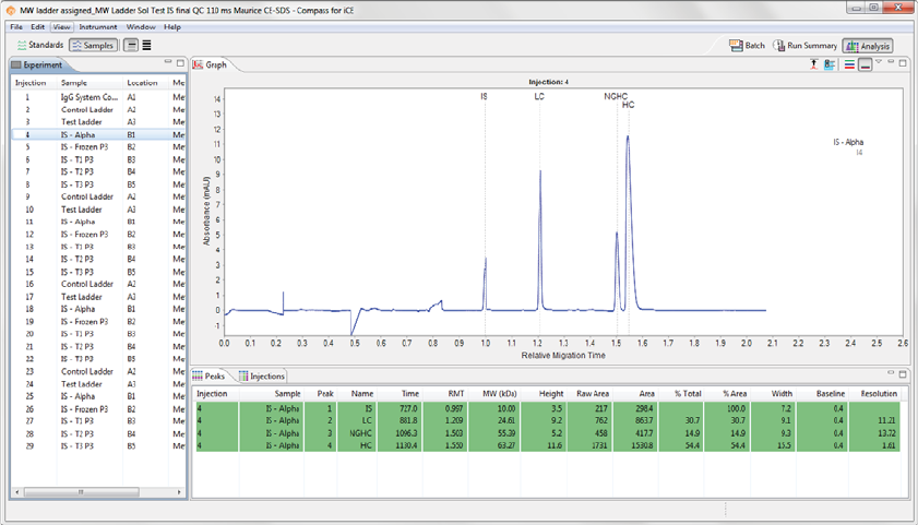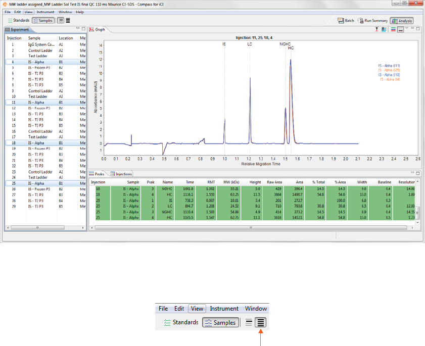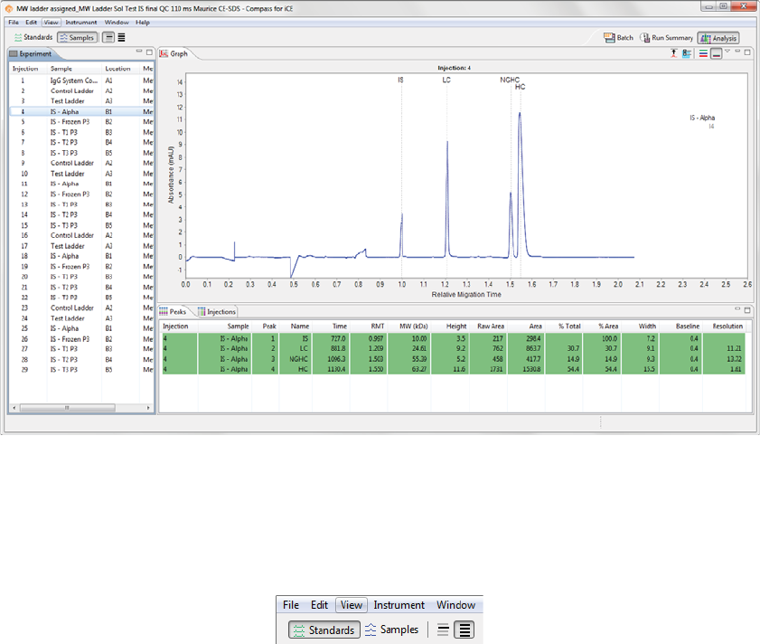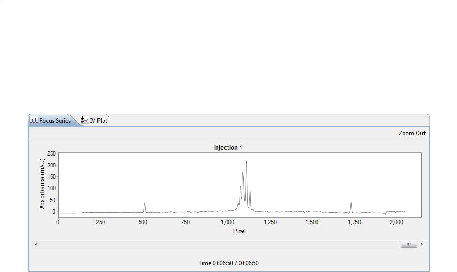 • Clicking on an injection displays its data in the Focus Series (cIEF) or Separation (CE-SDS) and IV Plot