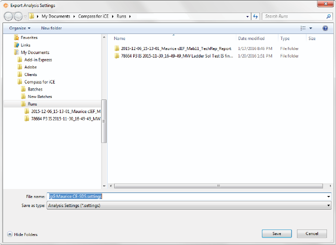 The analysis settings in a run file can be exported as a separate file. This allows the same analysis settings to