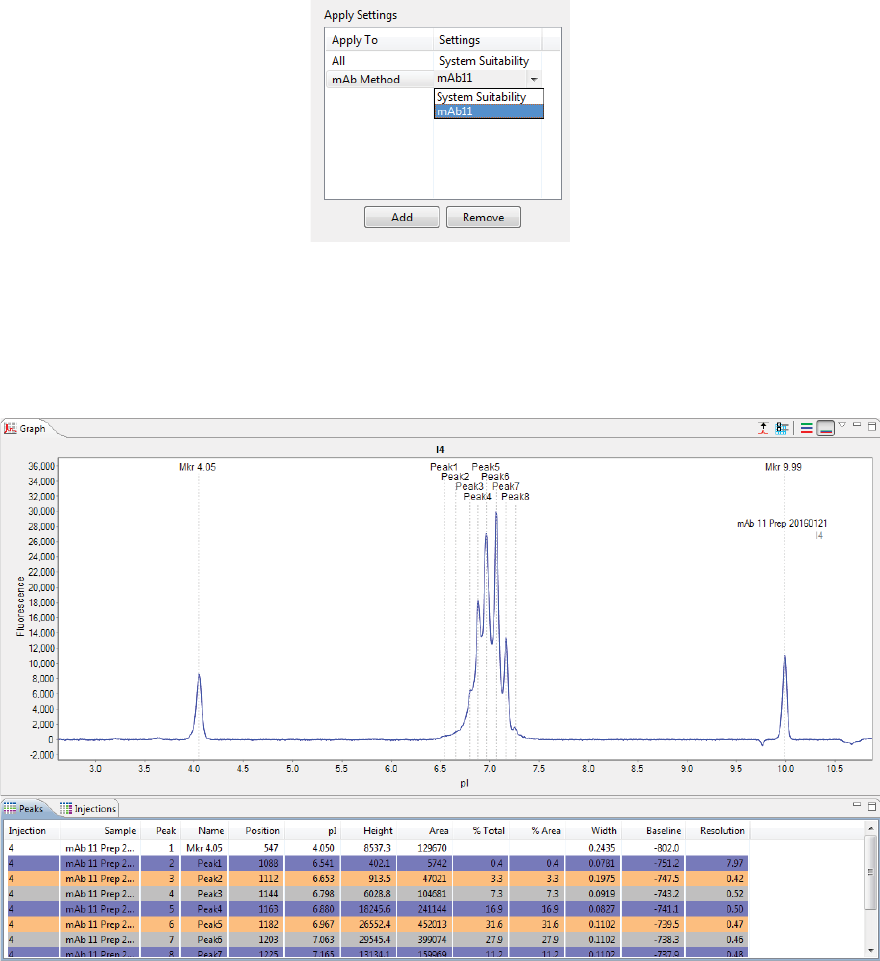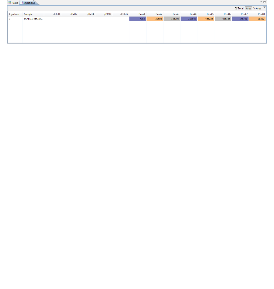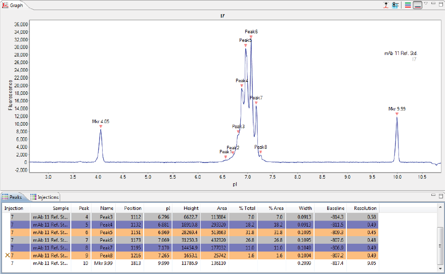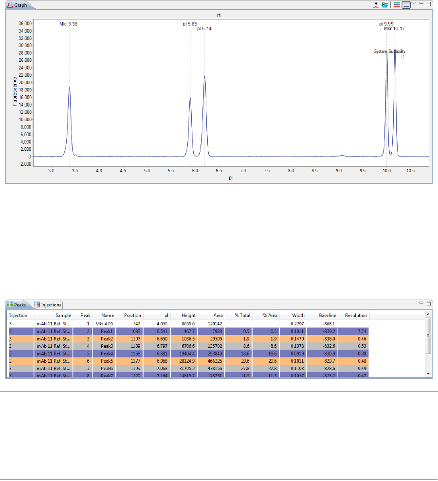 •Peaks - Shows the tabulated results for sample proteins and pI markers.
