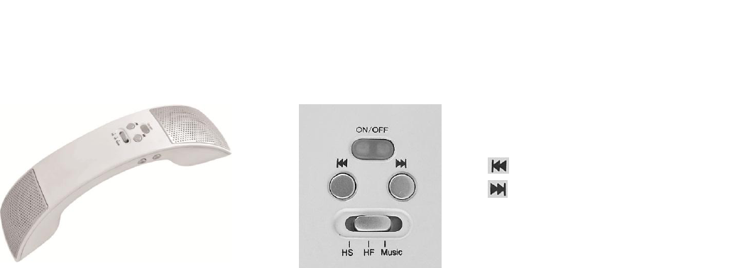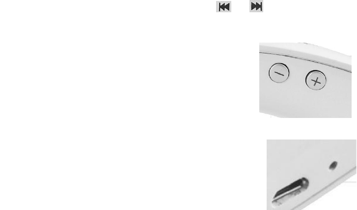 “+ or –”button to adjust volume; press the “ ”or “ ” to select the last song or the next song.