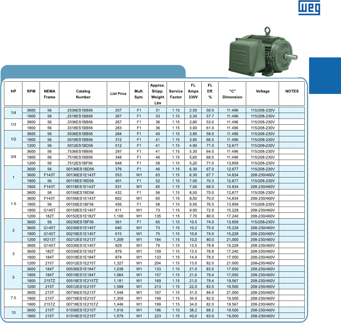 HP RPM NEMA Catalog Mult. Shipp. Service Amps Eff. "C" Voltage NOTES