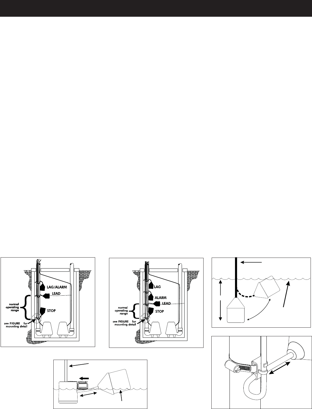 3. Mount fl oat switches at appropriate levels as illustrated in Figures 3-5.