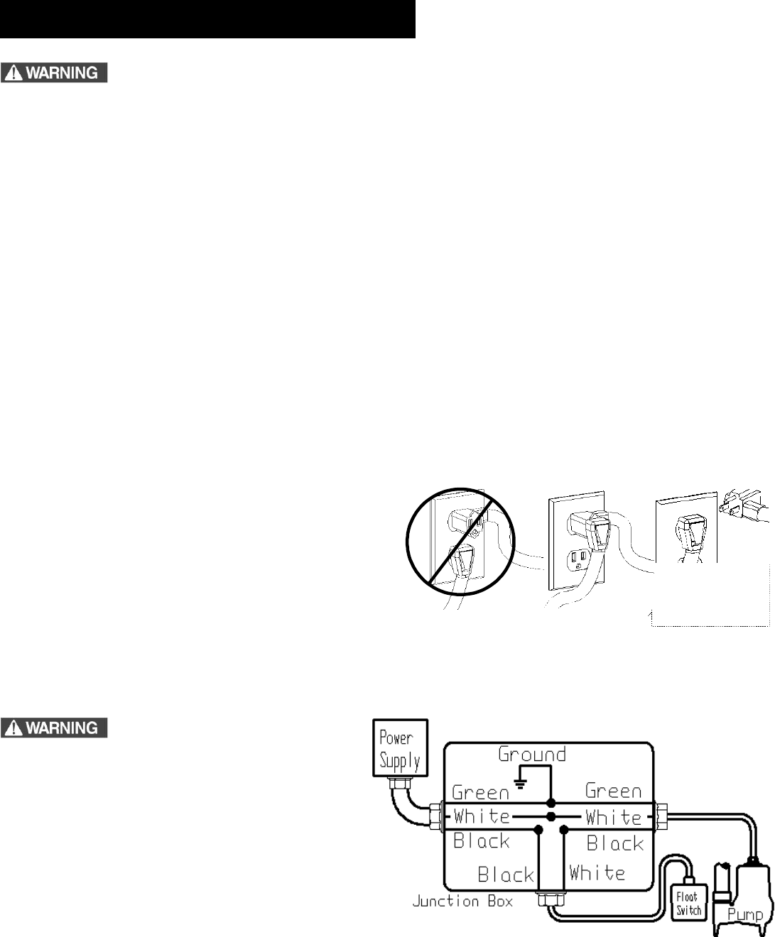 The electrical outlet or panel shall be within the length limitations of the pump power cord, and at least 4 feet above floor level
