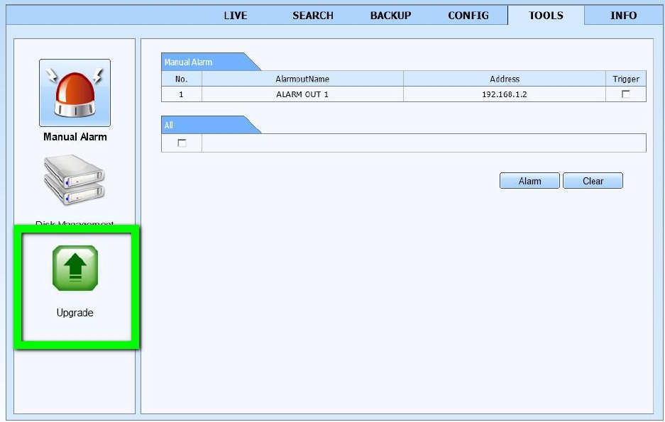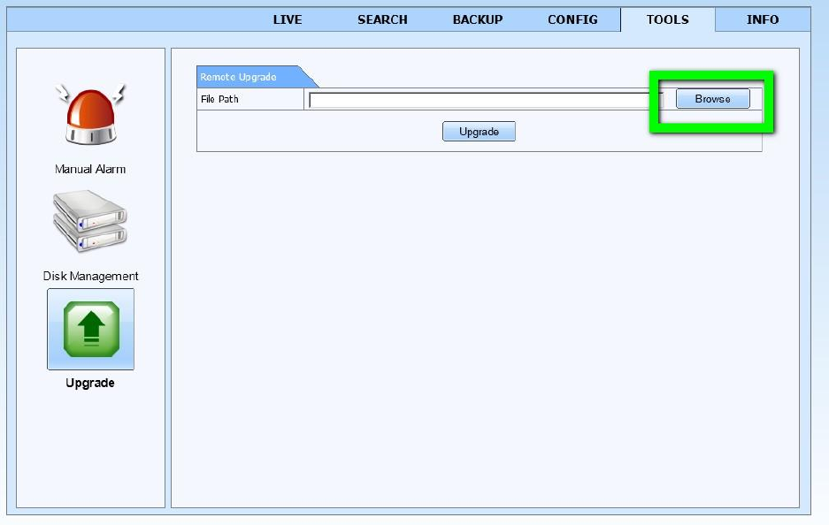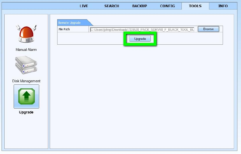 7. Click on the “Upgrade” button as shown below and the update process will begin. The DVR will