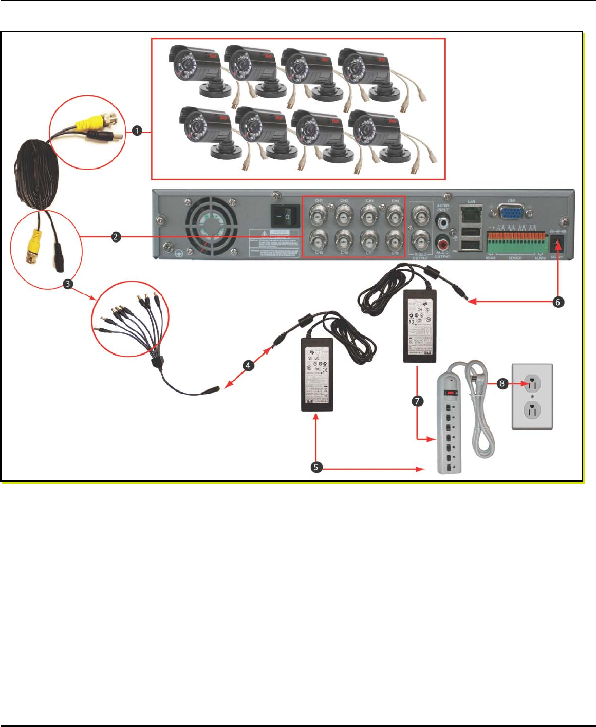 5. Plug the power adapter into the surge protector. Repeat steps 1-4 until all cameras are connected to