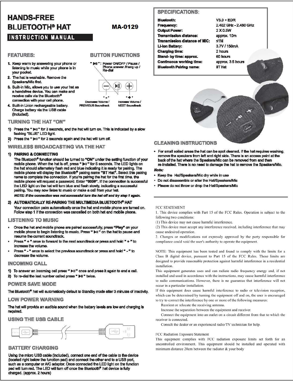 QI SHENGLONG IST QSLMA0129 Hands-Free Bluetooth Hat User Manual Manual