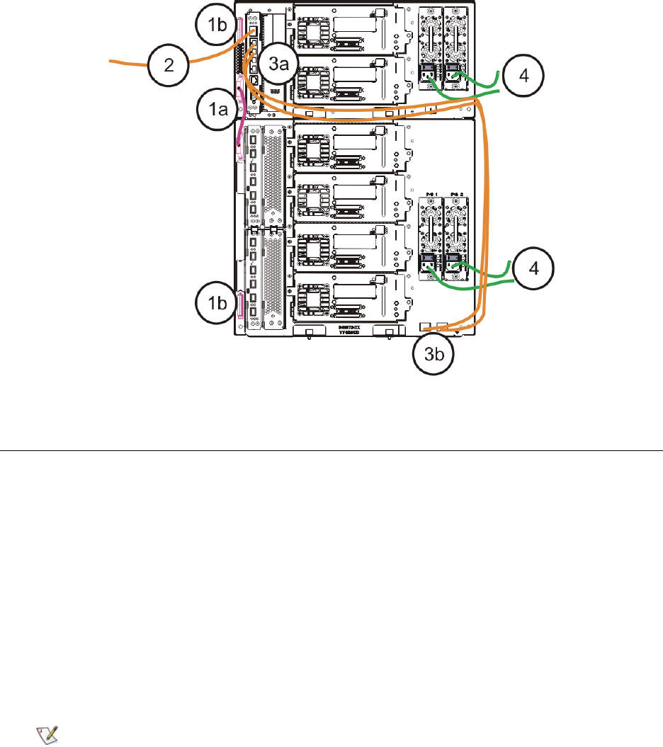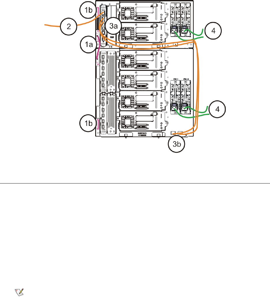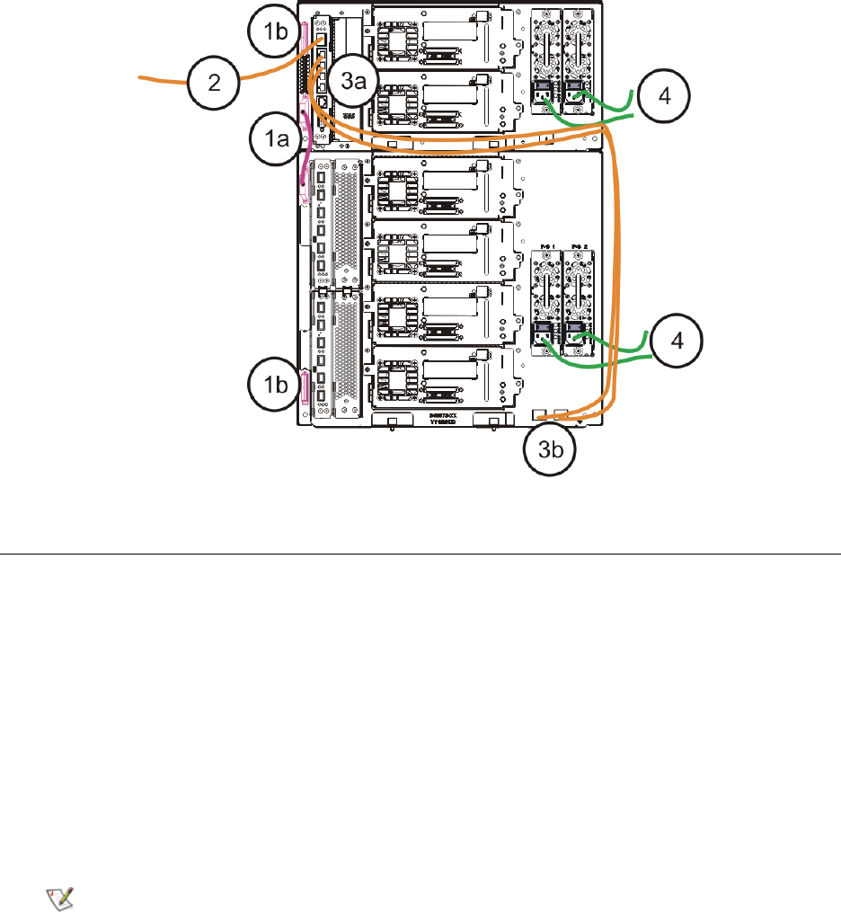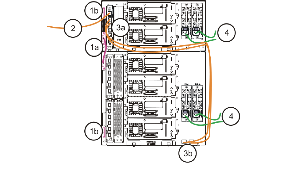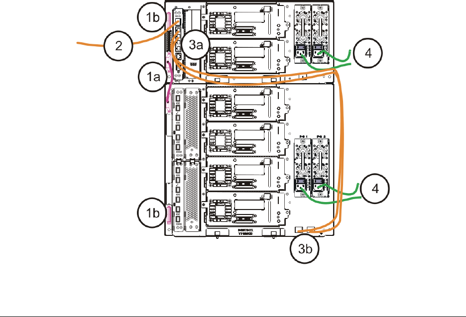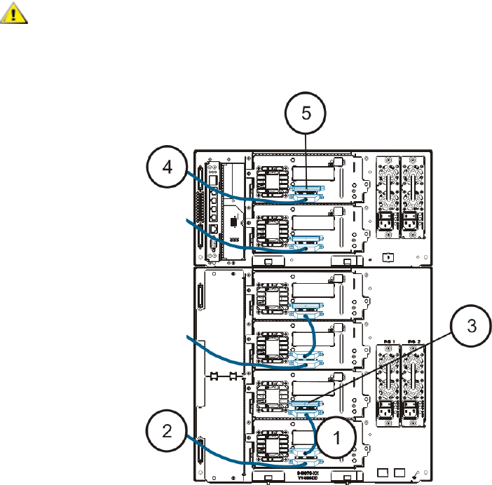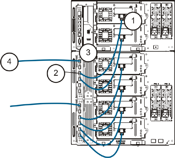 b. 将电缆另一端连接到 9U 扩展模块上的对应端口。 如果光纤通道 I/O 刀片安装在高端机架上,