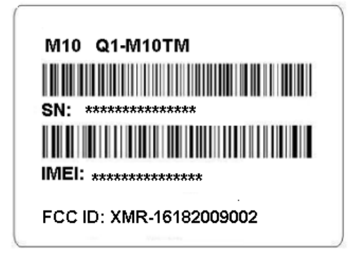 “Contains FCC ID:XMR-16182009002 ”M10 FCC label is shown as: