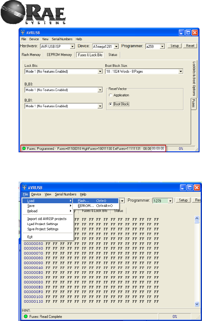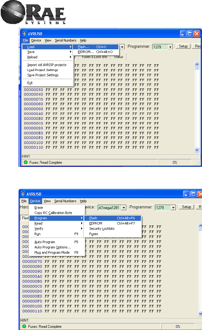 d) click “File” ->”Open data file” to choose RAELoader_Sam7x *.hex file.