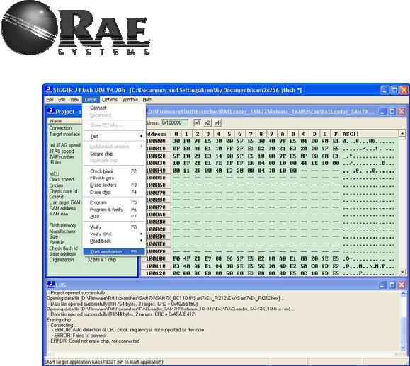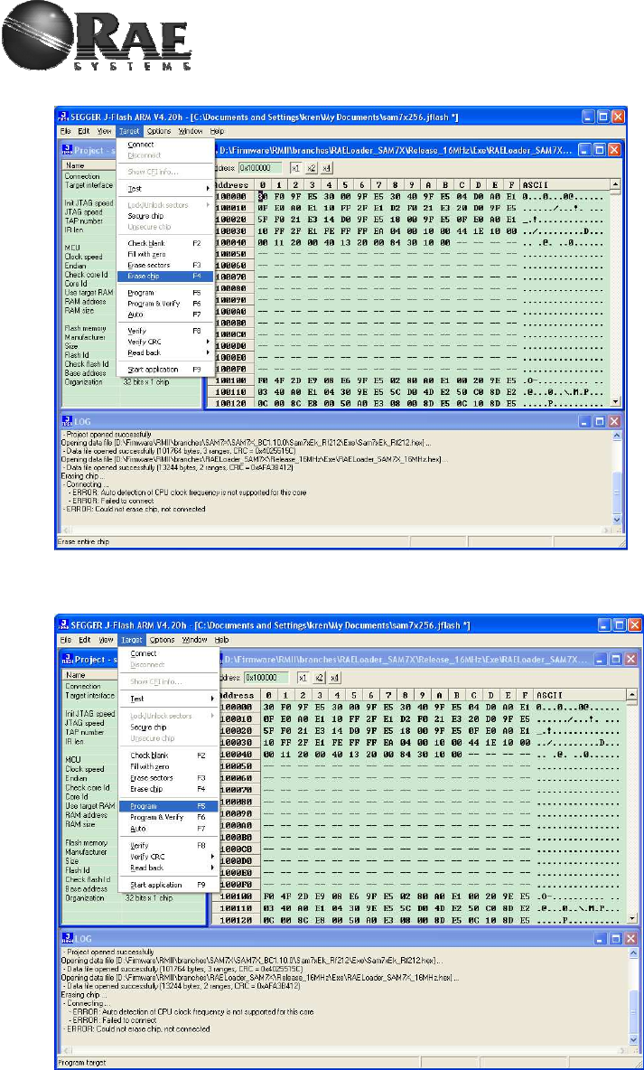 e) click “Target” -> “Erase chip” to erase all flash memory.