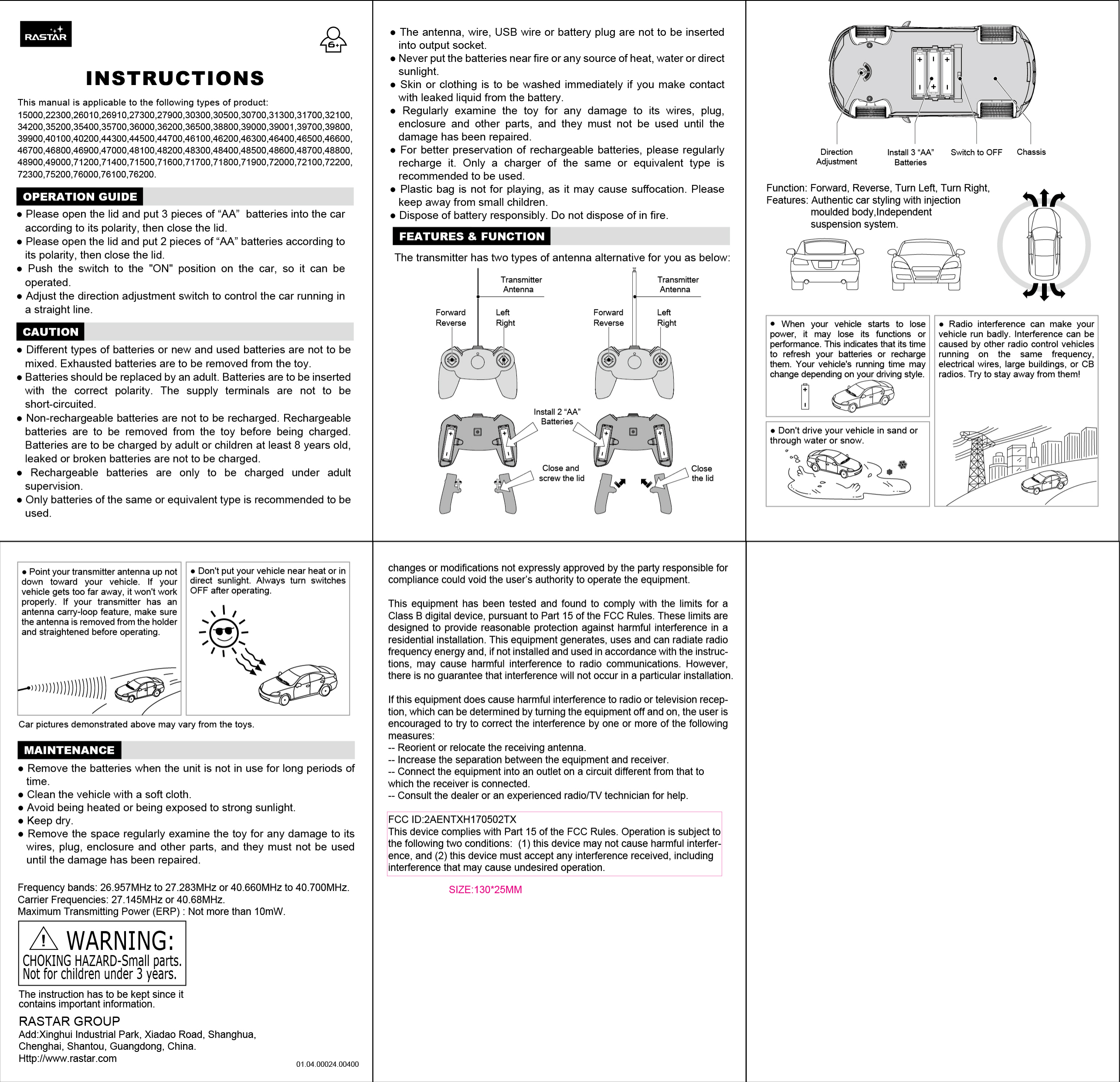 RASTAR GROUP XH170502TX Model R/C Car User Manual