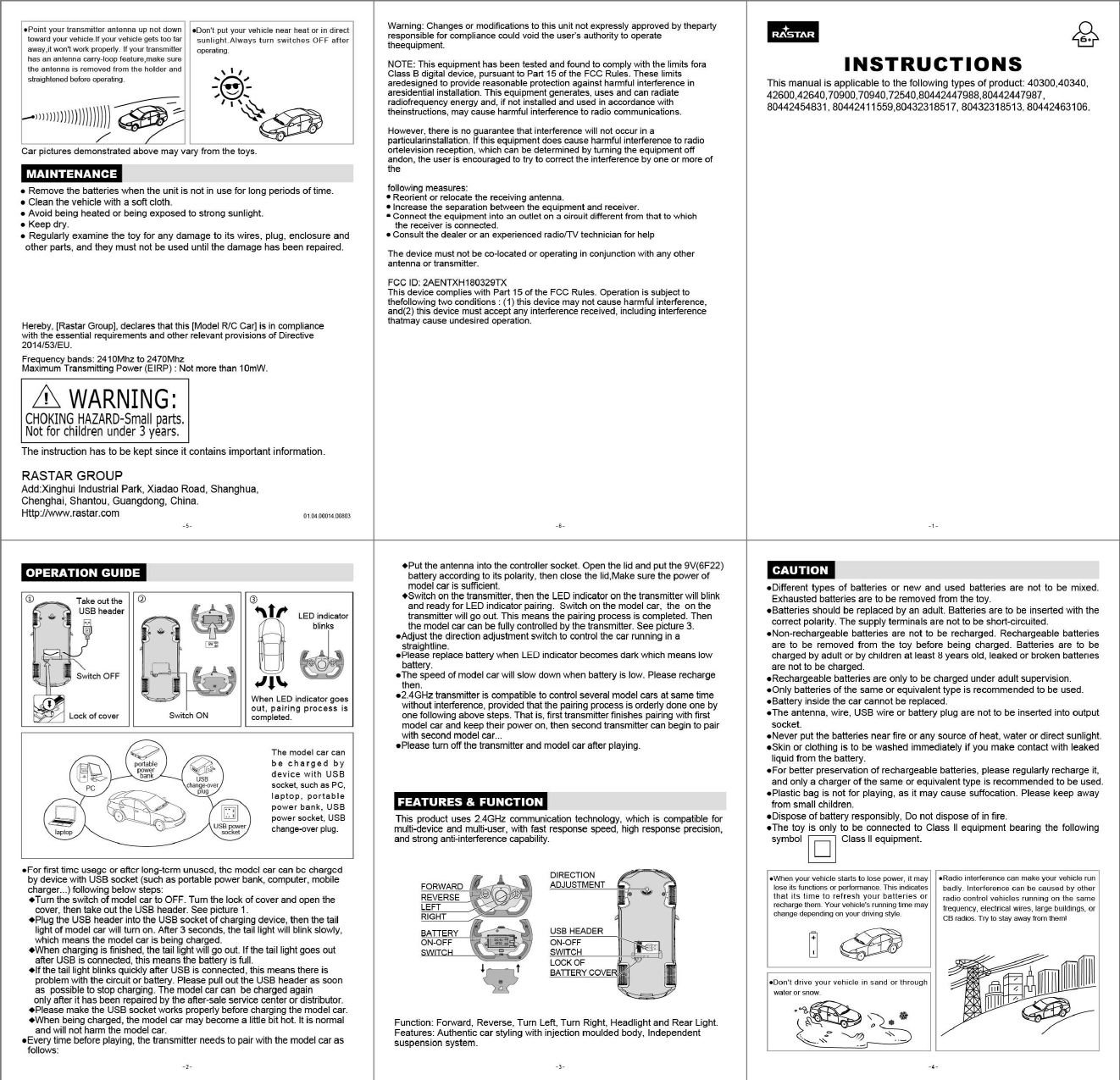 RASTAR GROUP XH180329TX Model R/C Car User Manual Full page photo