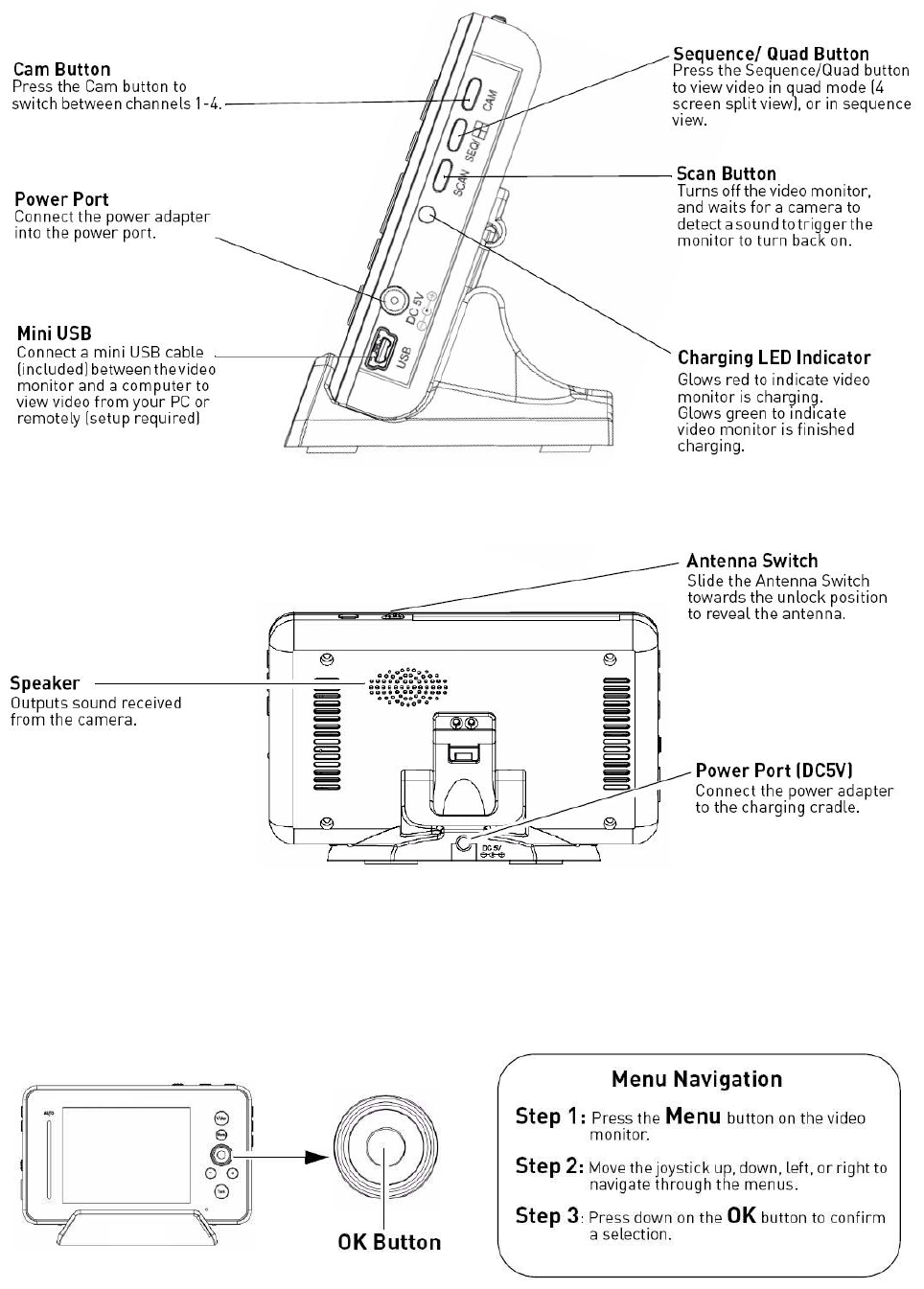 2. Slide the power switch to ON position. The video monitor will automatically scan for cameras in range.