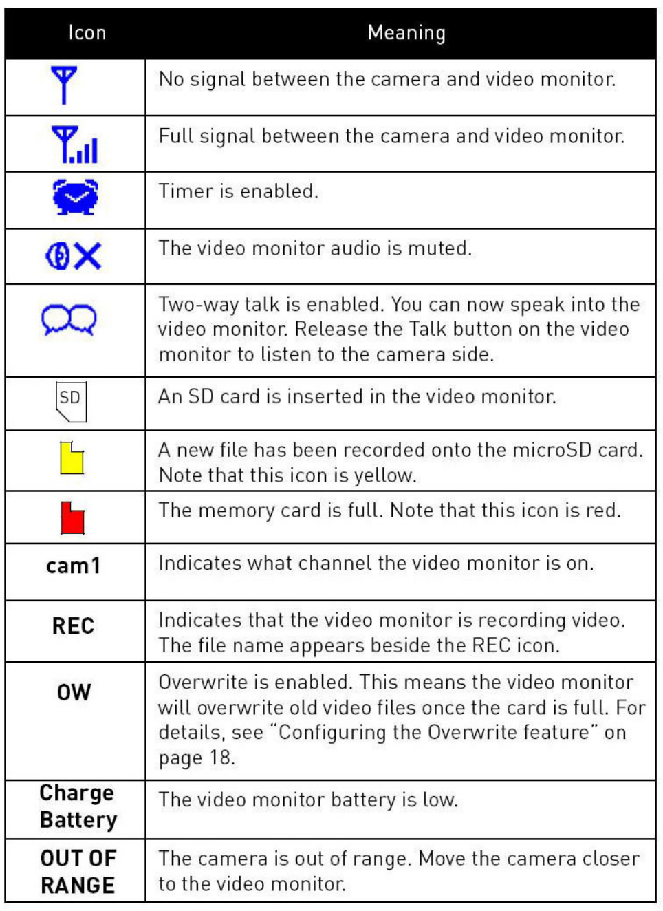 The video monitor displays the following icons during normal use. The table below summarizes the video