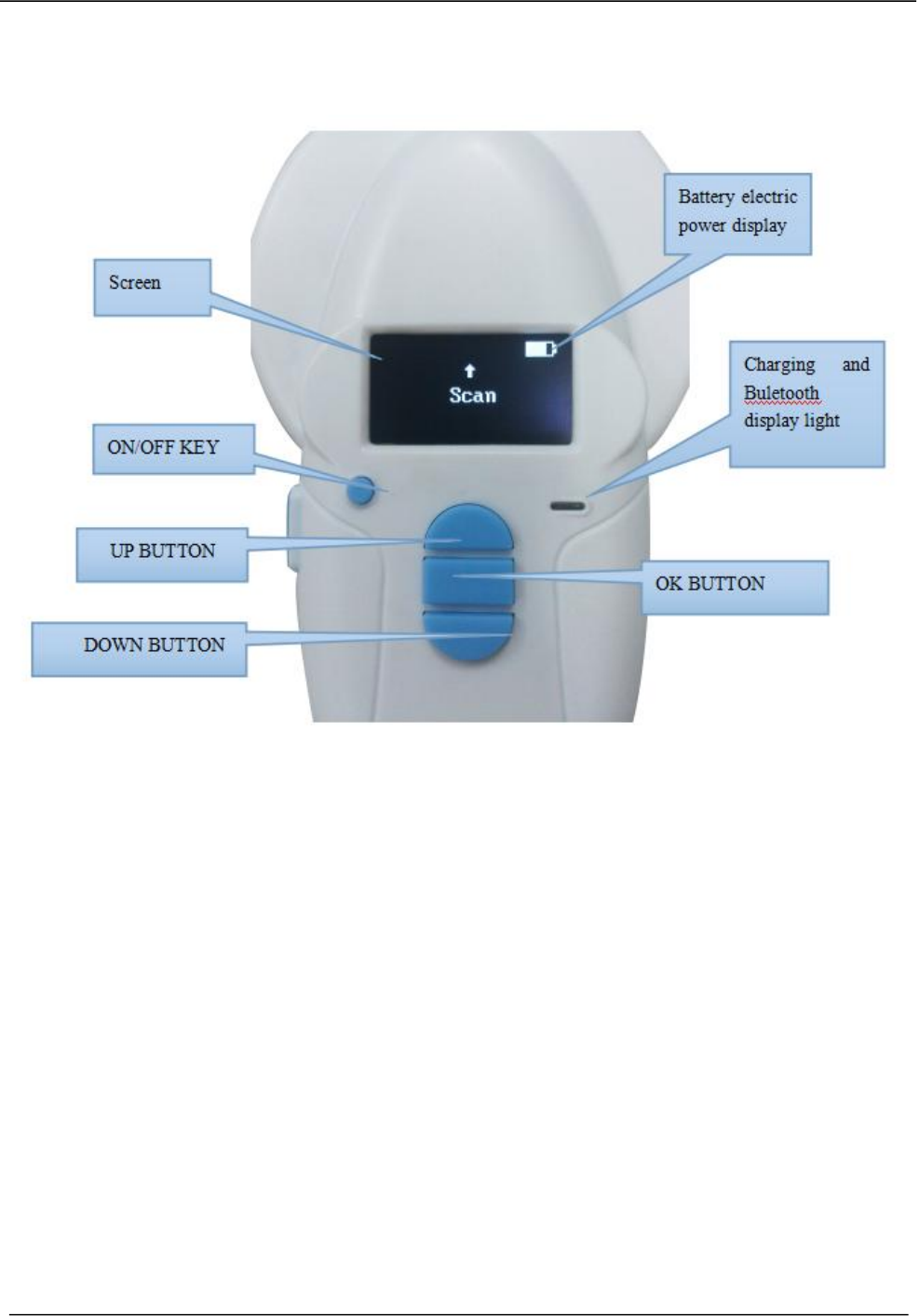 Press on/off button will open reader, after open, blue LED will display; Press