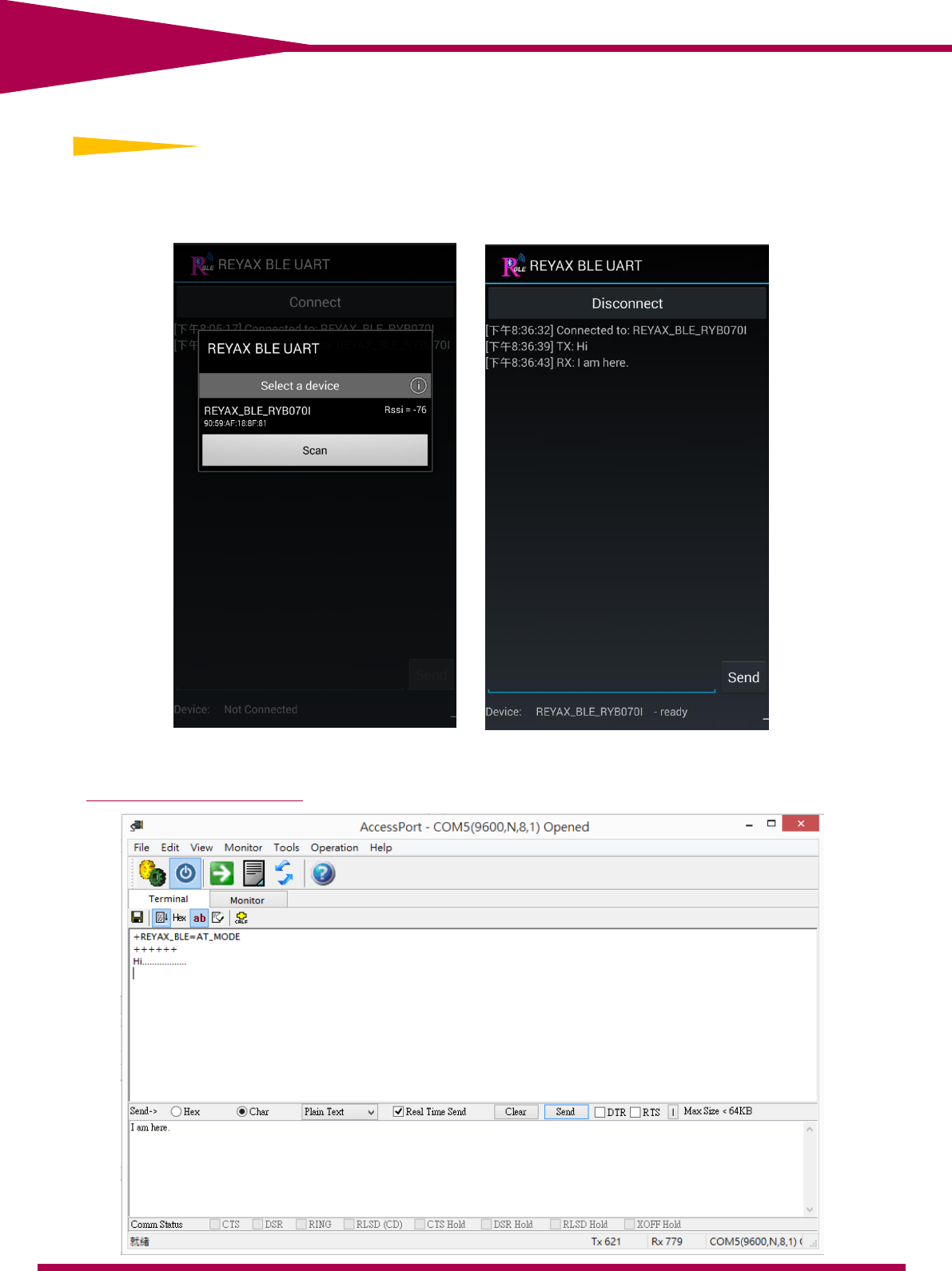 terminal on PC, and then sent from the PC Hyper-terminal to smartphone APP (Ex. "I am here.")