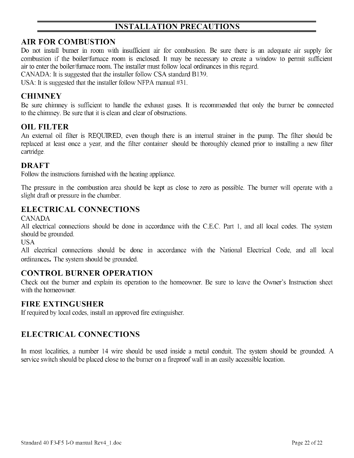 USA: It is suggested that the installer follow NFPA manual #31.