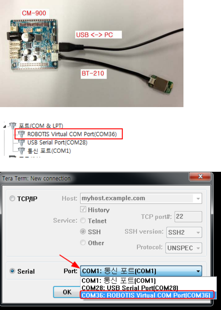 • Connect the CM-900 to the PC via US; install drivers; Tera Term terminal uses the actual COM