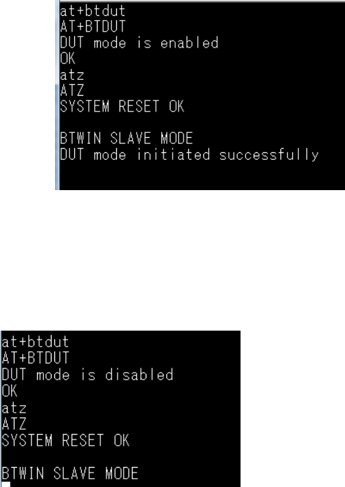 To exit DUT mode enter the command AT+BTDUT and DUT mode is disabled will display; enter