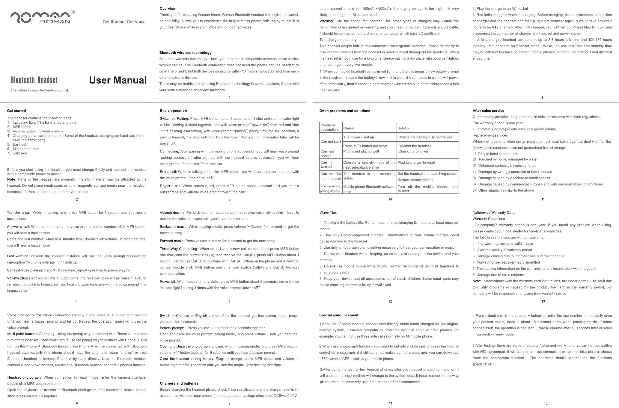 SHENZHEN ROMAN TECHNOLOGY CO.,LTD. Bluetooth Headset Manual
