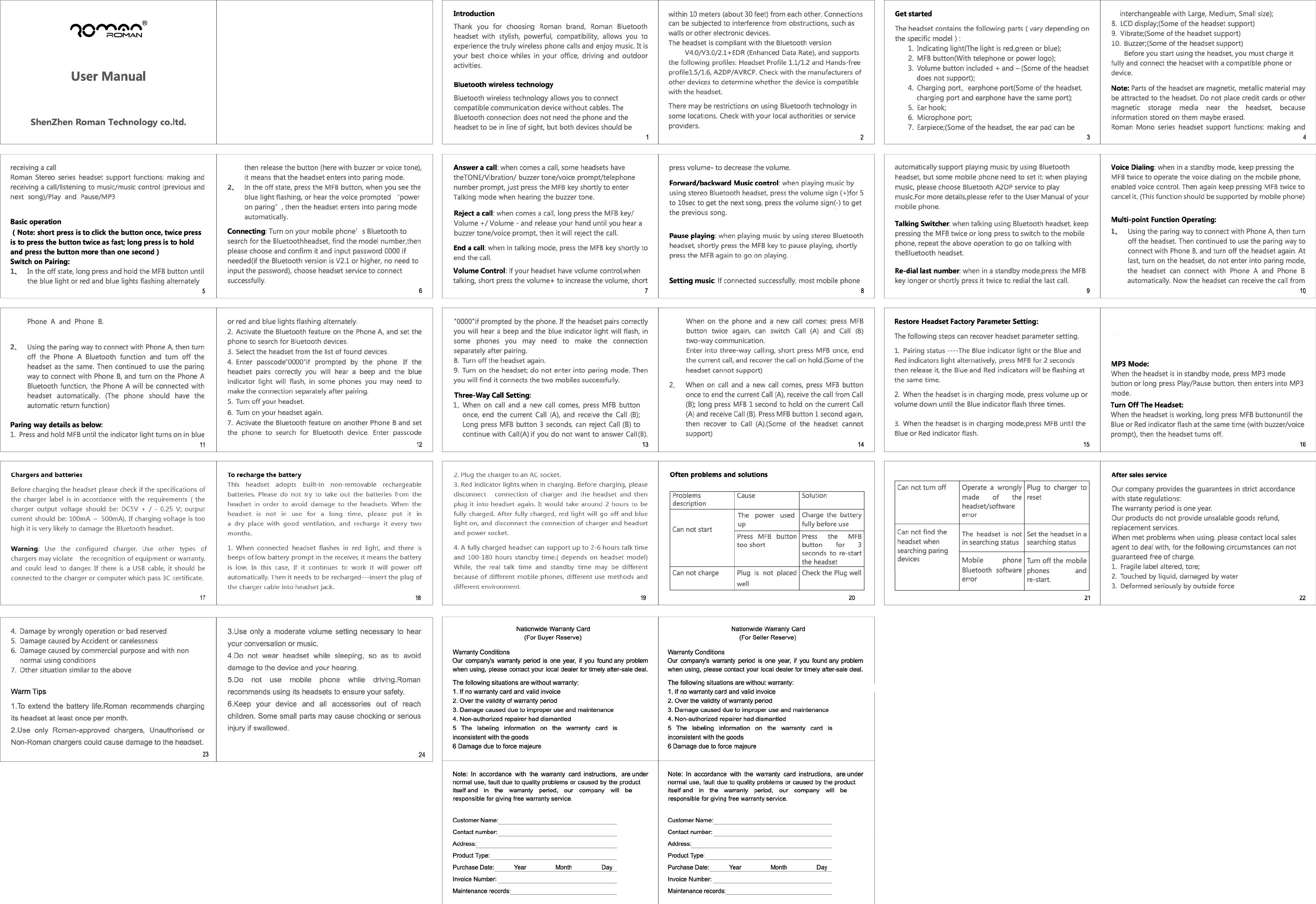 SHENZHEN ROMAN TECHNOLOGY CO.,LTD. Bluetooth Headset Users Manual