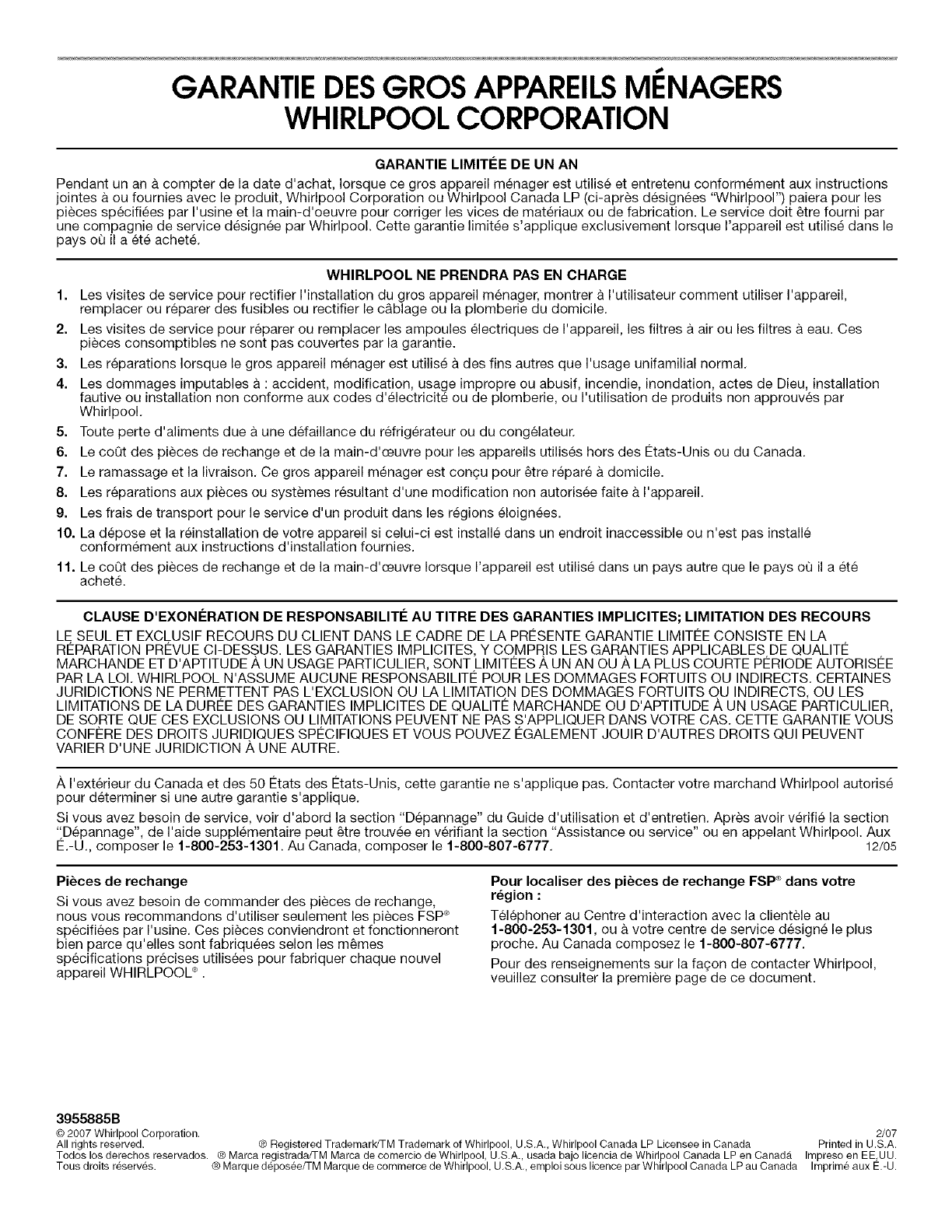 All rights reserved. ® Registered Trademark/TM Trademark of Whirlpool, U.S.A., Whirlpool Canada LP Licensee in Canada Printed in U.S.A.