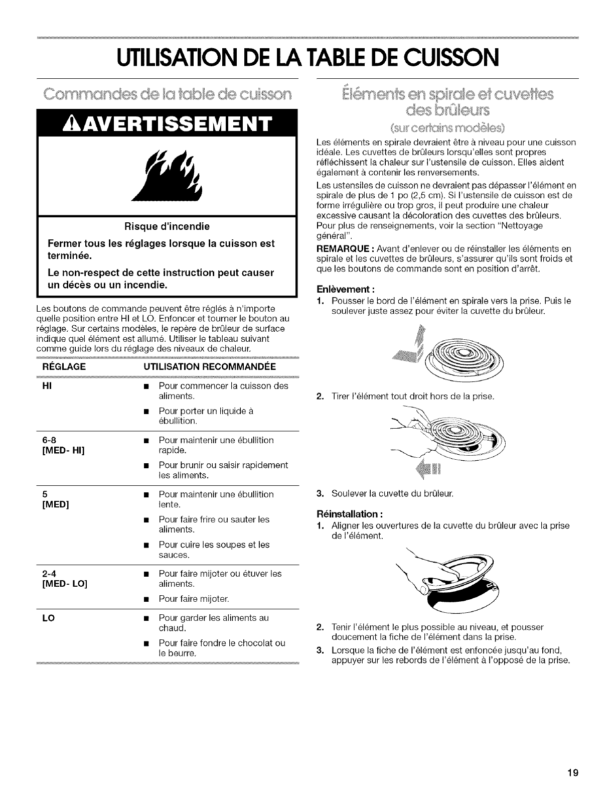 UTILISATION DE LA TABLE DE CUISSON ................................ 19