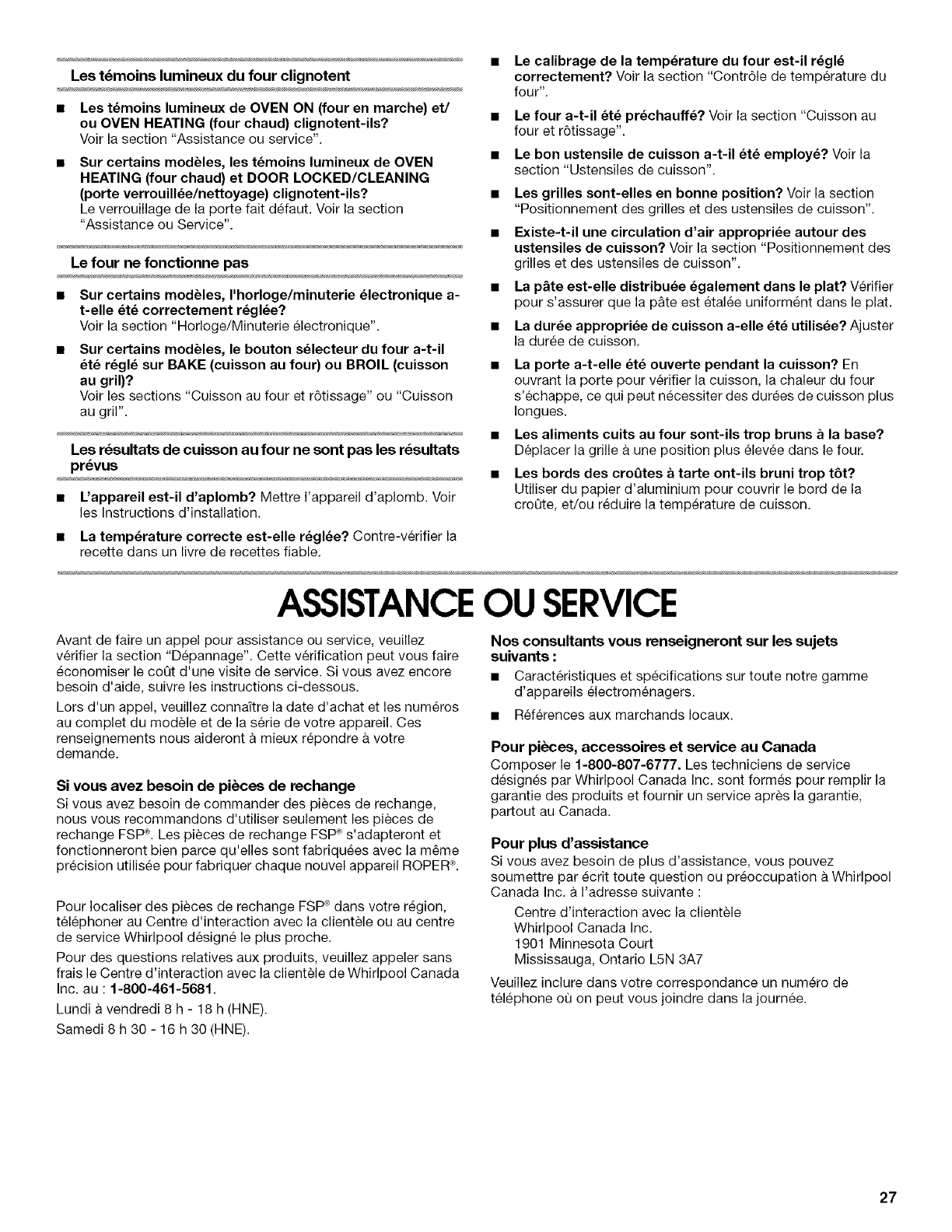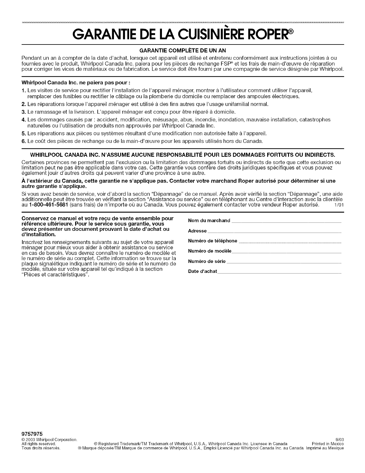 au 1-800-461-5681 (sans frais) de n'importe ou au Canada. Vous pouvez egalement contacter votre vendeur Roper autoris& 1/01