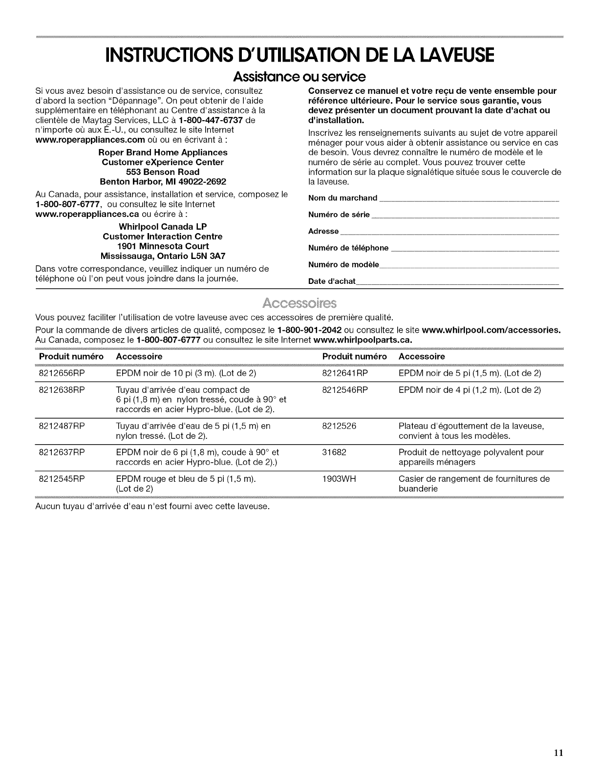 ASSISTANCE OU SERVICE .................................................. 11