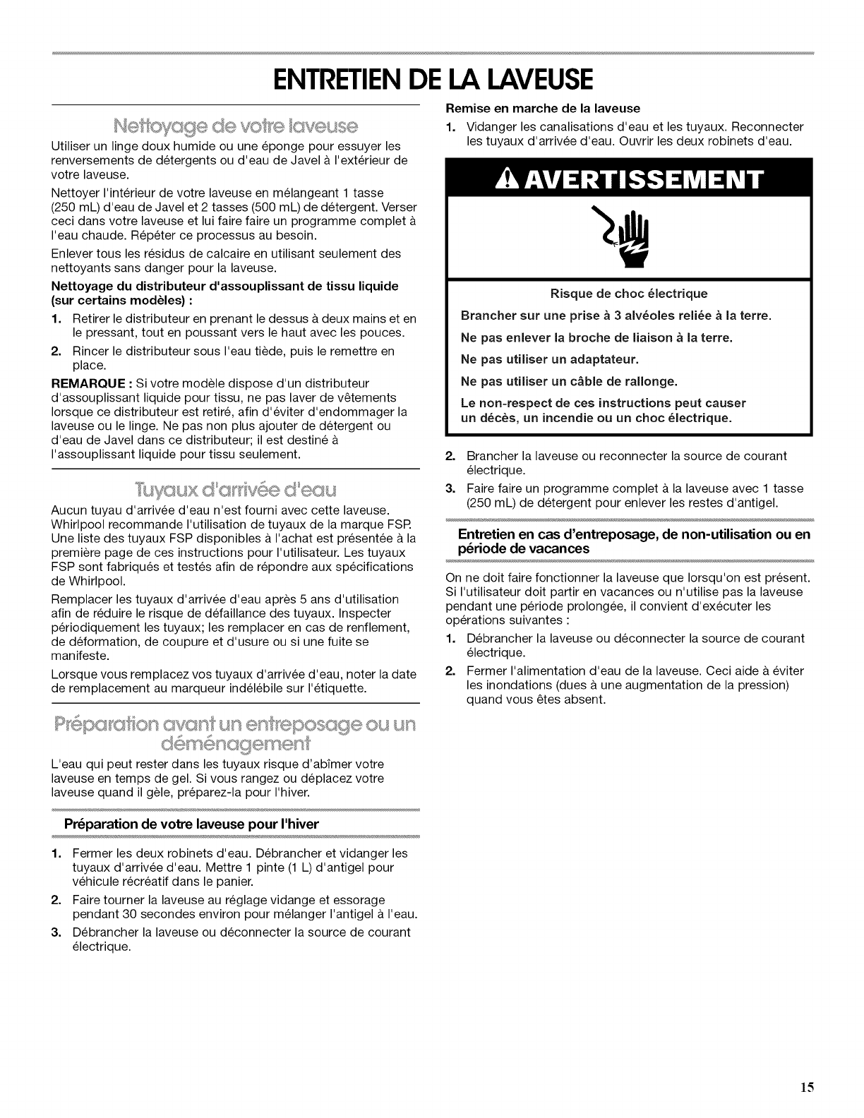 ENTRETIEN DE LA LAVEUSE .............................................. 15