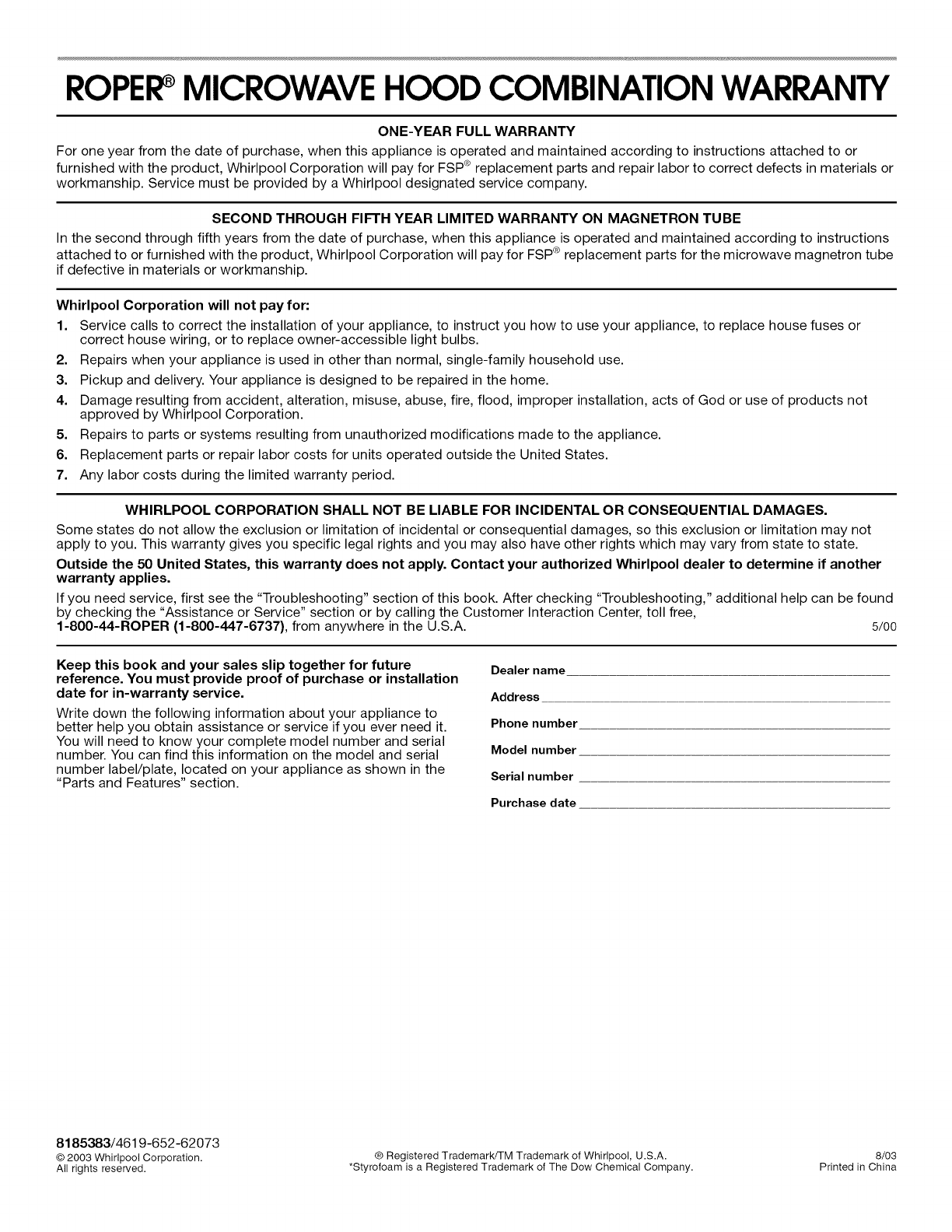ROPER MICROWAVE HOOD COMBINATION WARRANTY