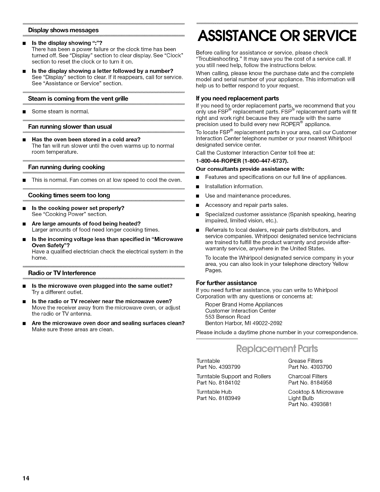 accessories or service, call: 1-800-44-ROPER (1-800-447-6737}.