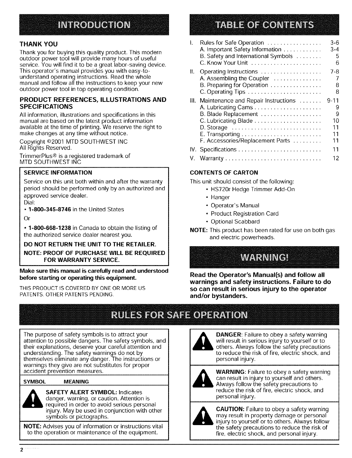 Copyright ©2001 MTD SOUTHWEST INC
