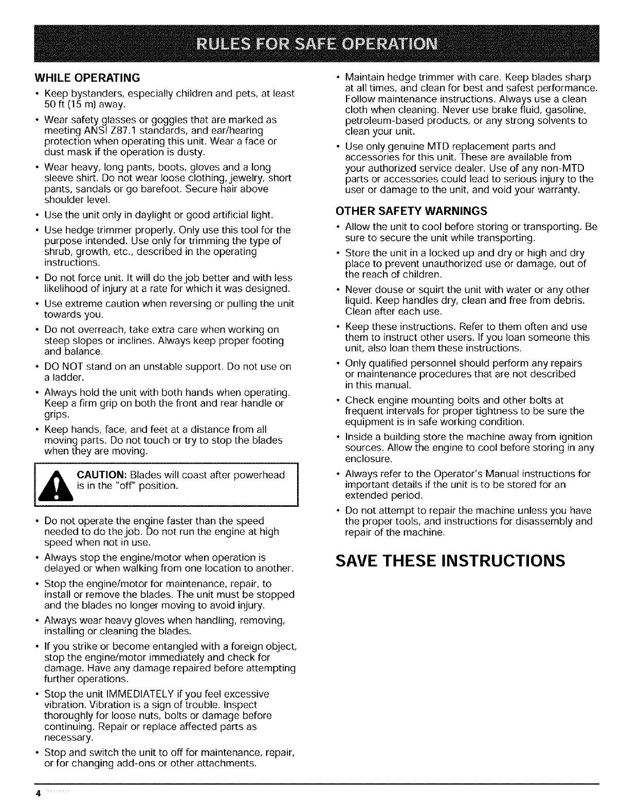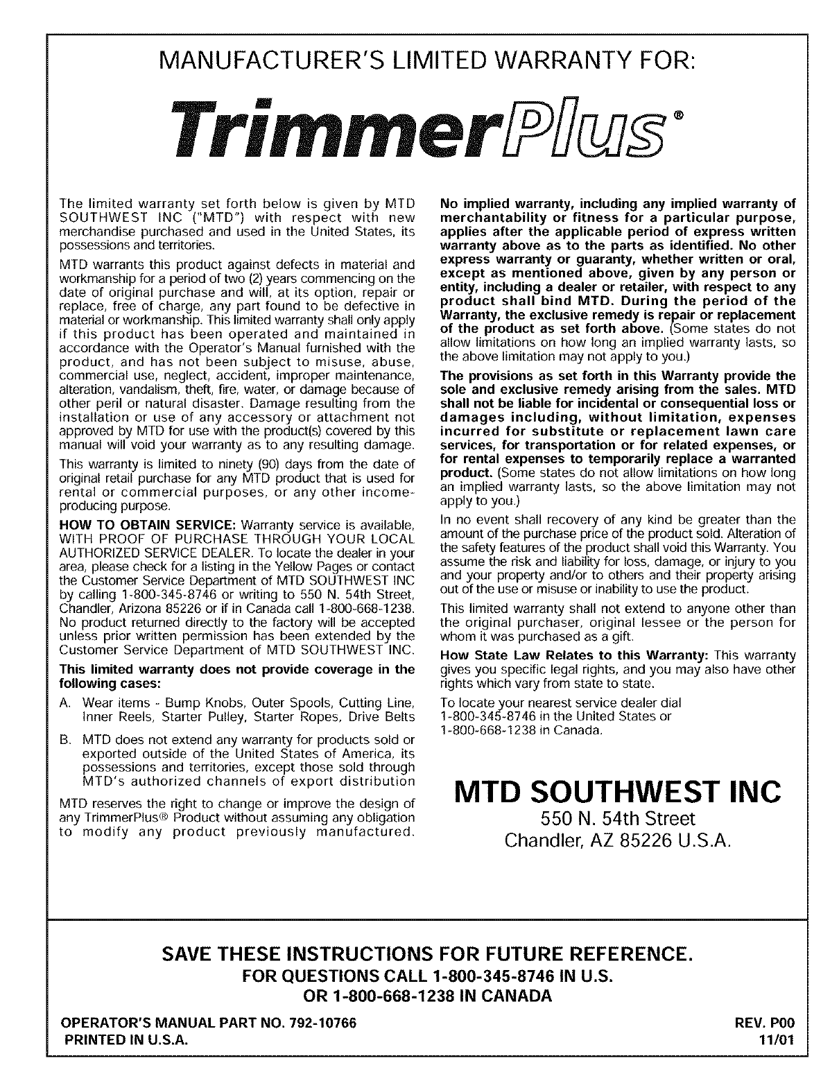 OPERATOR'S MANUAL PART NO. 792-10766 REV. P00