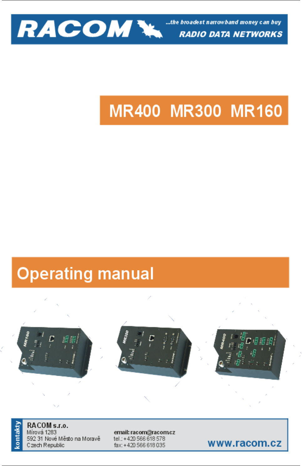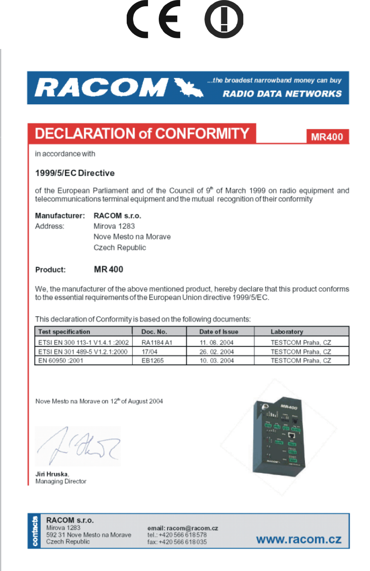 RACOM s. r. o. hereby declares that its radio modem MR400 (MR300, MR160) product complies with the basic