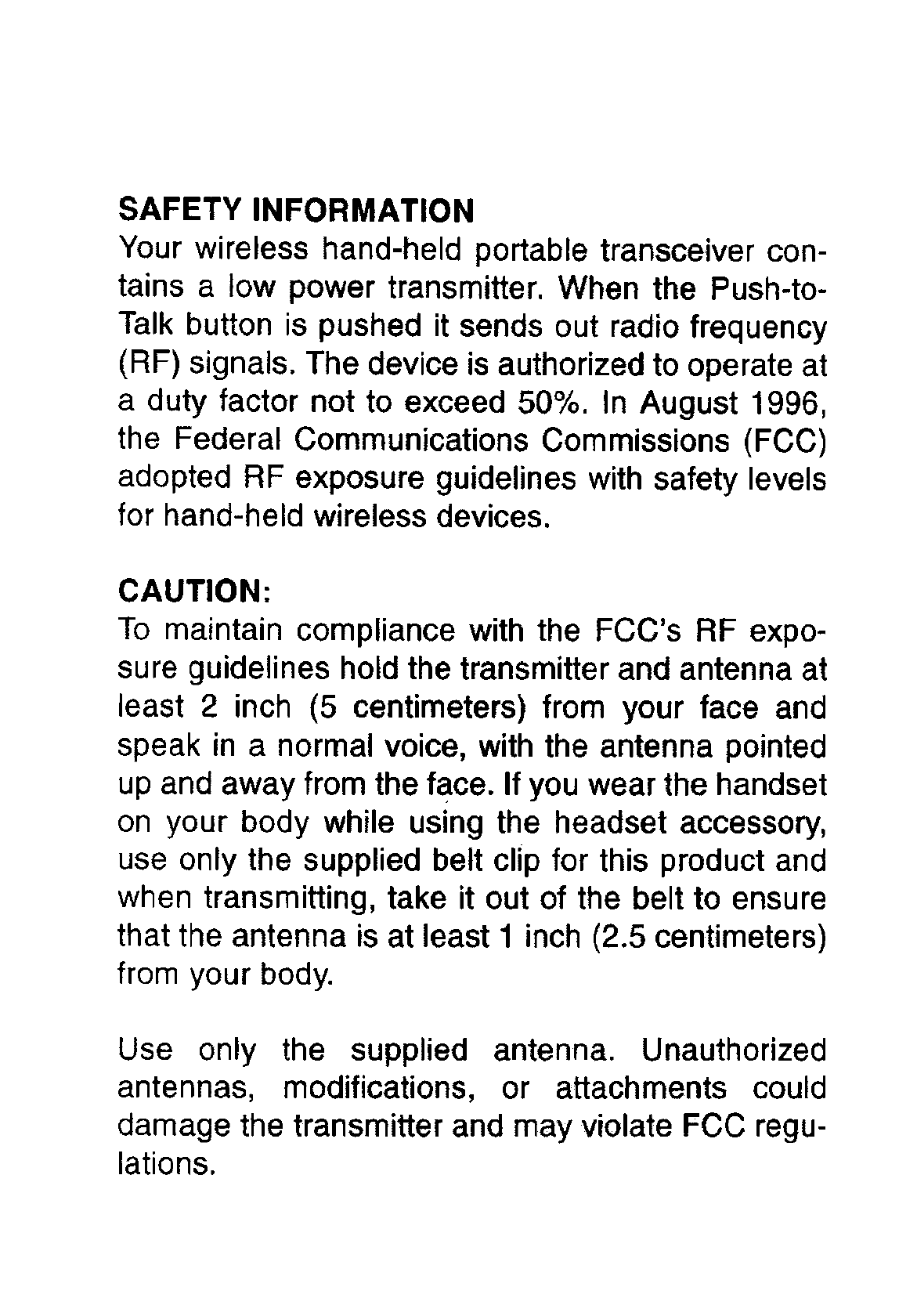 Radio Shack 2101855 Family Radio Service User Manual Safety information page