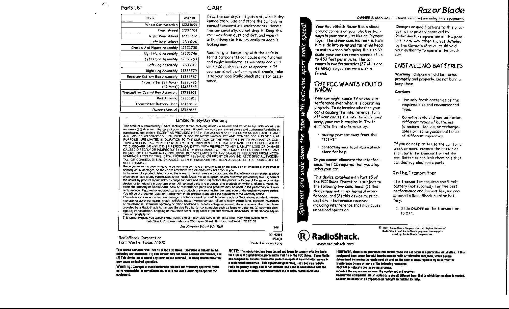 Radio Shack 6004284RX Remote Contro Toy Car User Manual Manual