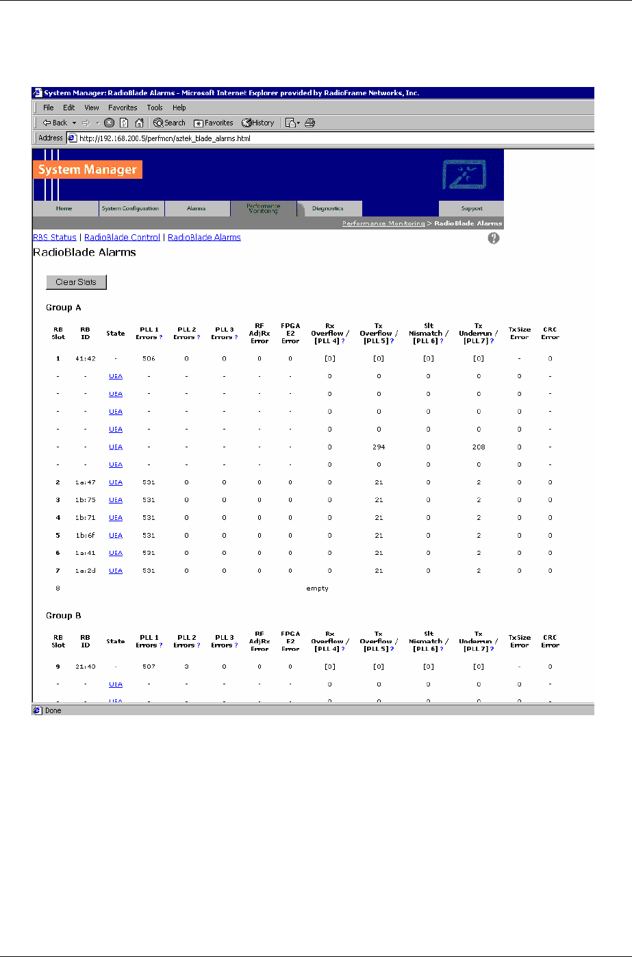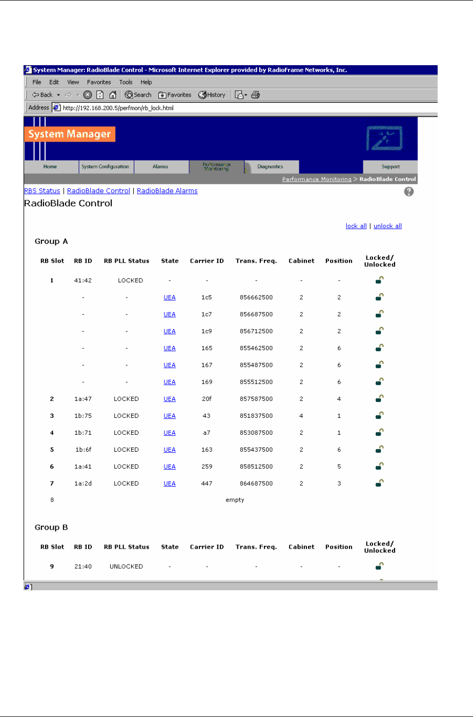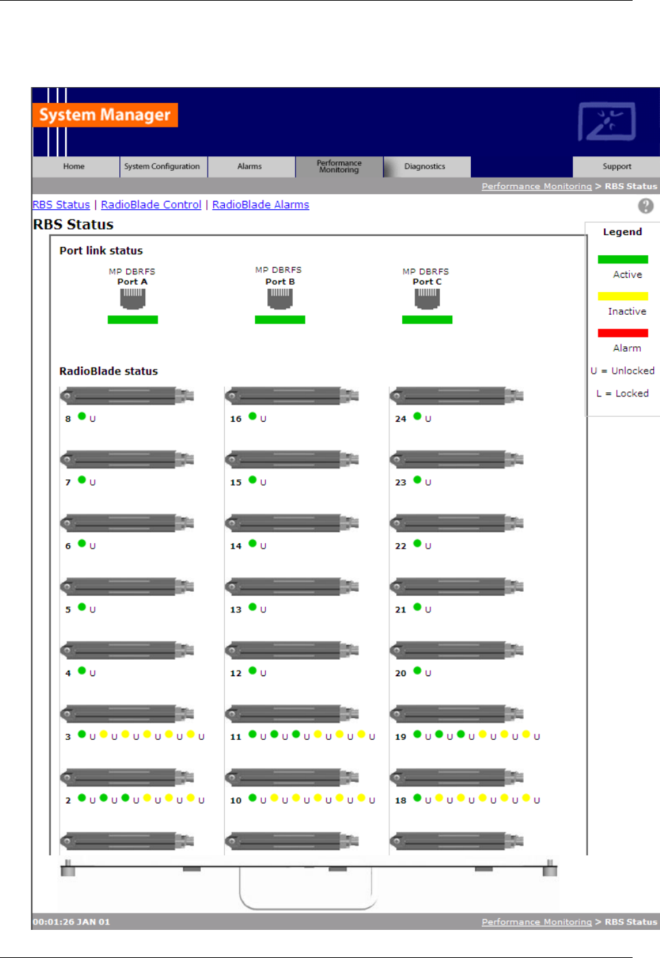 2 Display the RBS Status page, and verify that all RadioBlade transceiver status